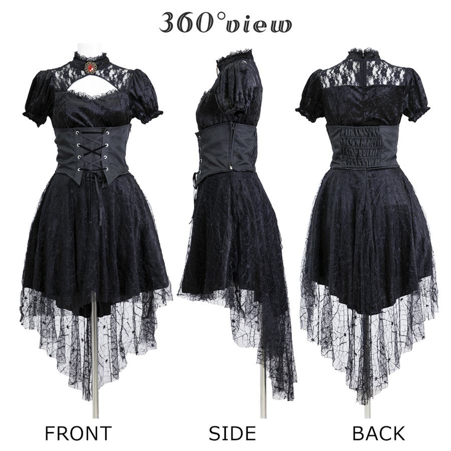 蜘蛛の巣柄のレース生地を重ねたミニ丈ワンピースに、コルセットで上品に仕上げた、可愛らしいスタイル。