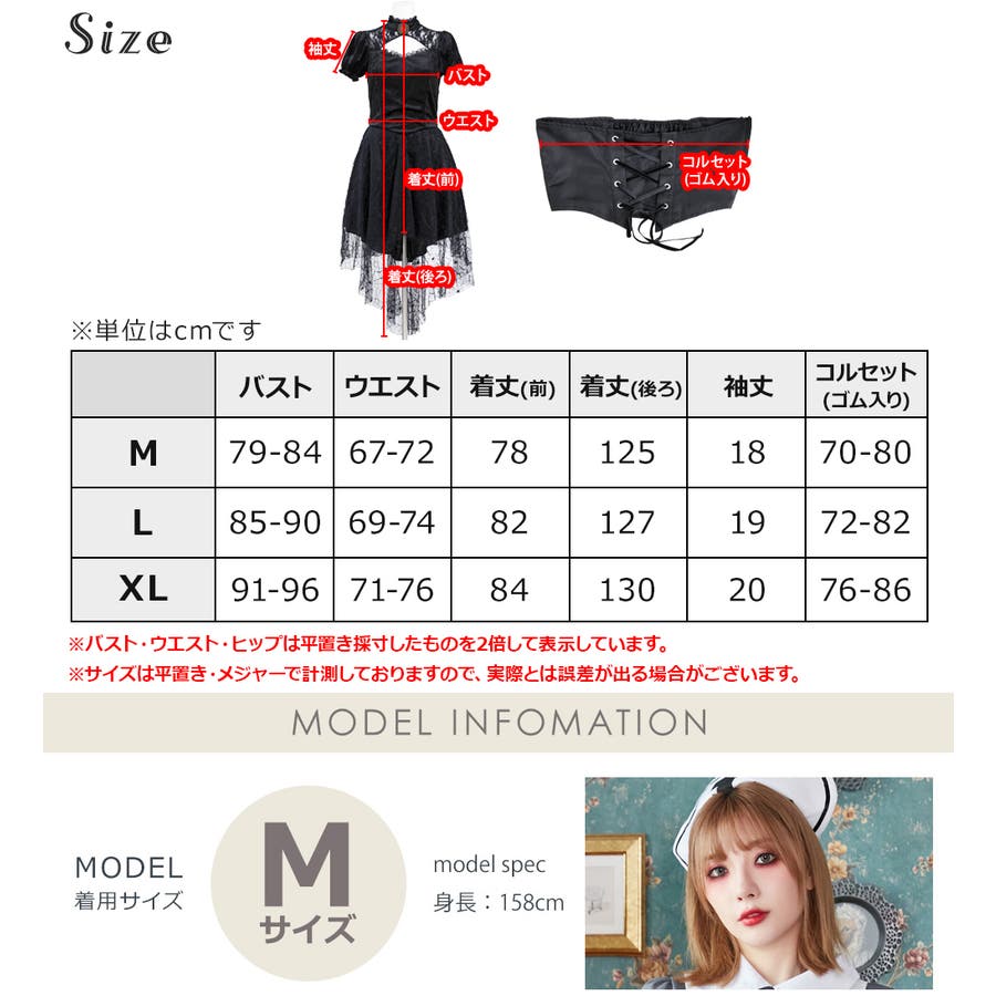 【Mサイズ】バスト:79-84 ウエスト:67-72 着丈(前):78 着丈(後ろ):125 袖丈:18 コルセット(ゴム入り):70-80