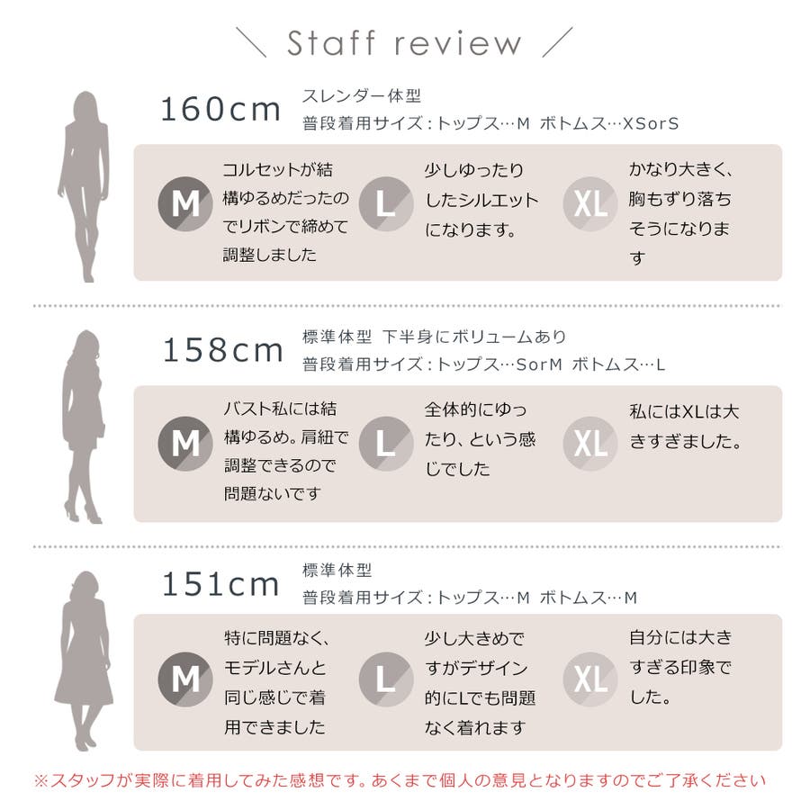 【XLサイズ】バスト(ワンピース):85-90 ウエスト(ワンピース):75-80 着丈(ワンピース):60 身幅(コルセット)※ゴム入り:86-92 バスト(トップス):103-108 裄丈(トップス):65 ウエスト(ボトムス)※ゴム入り:64-96 着丈(ボトムス):36