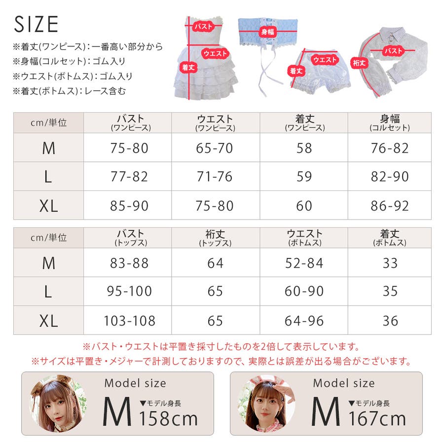 【Mサイズ】バスト(ワンピース):75-80 ウエスト(ワンピース):65-70 着丈(ワンピース):58 身幅(コルセット)※ゴム入り:76-82 バスト(トップス):83-88 裄丈(トップス):64 ウエスト(ボトムス)※ゴム入り:52-84 着丈(ボトムス):33