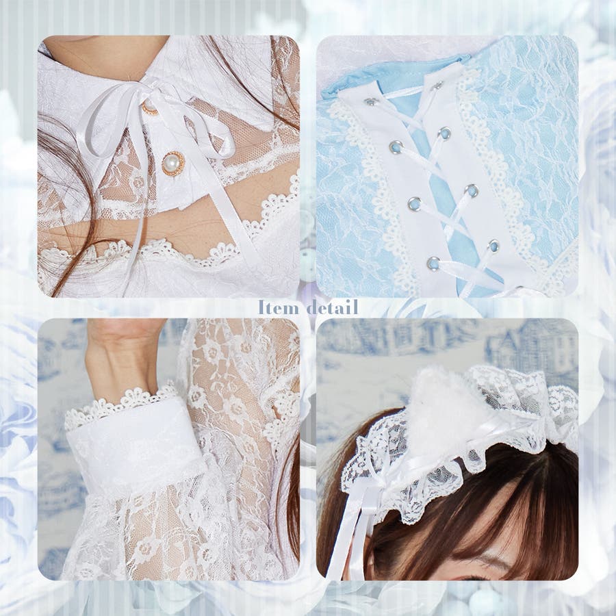 ・ワンピース1着 ・透明ストラップ・コルセット風ベルト・ドロワーズ風パンツ・猫耳ヘッドドレス・しっぽ・腰ベルト・首リボン