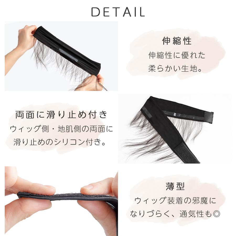 バンドは伸縮性のある薄手の素材で、ウィッグ装着の邪魔になりづらく、お手持ちのウィッグネットやウィッグキャップと合わせてお使い頂けます。両面に付いた滑り止めシリコンがウィッグのズレも防いでくれます。