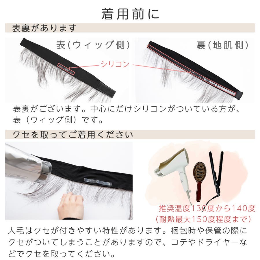 人毛を使用している為、梱包時に癖がついている場合がございます。その場合はコテやアイロンを使いスタイリングし直してからご着用ください。アイロン・コテ・ドライヤーを使用される際は、シリコン部分を痛めないようにご注意ください。