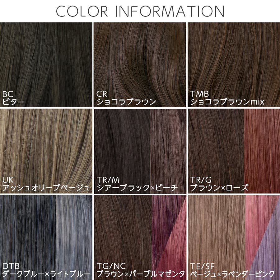 | カラー | BCビター / CRショコラブラウン / TMBショコラブラウンmix / UKアッシュオリーブベージュ / TR/Mシアーブラック×ピーチ / TR/Gブラウン×ローズ / DTBダークブルー×ライトブルー / TG/NCブラウン×パープルマゼンタ / TE/SFベージュ×ラベンダーピンク |