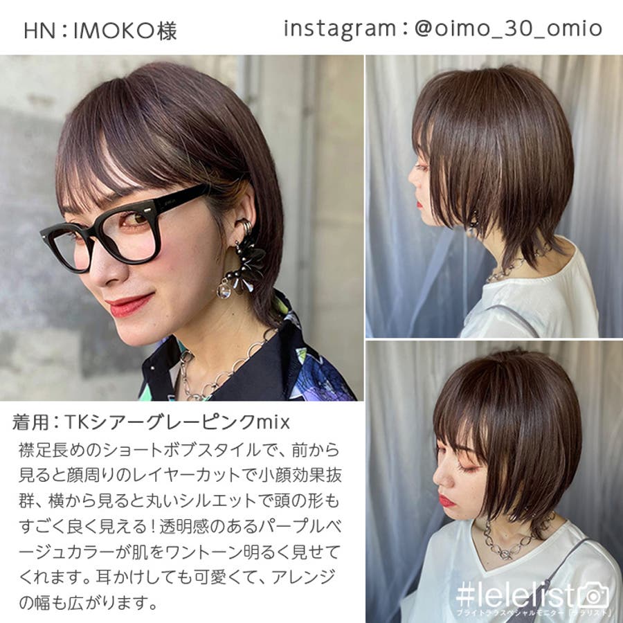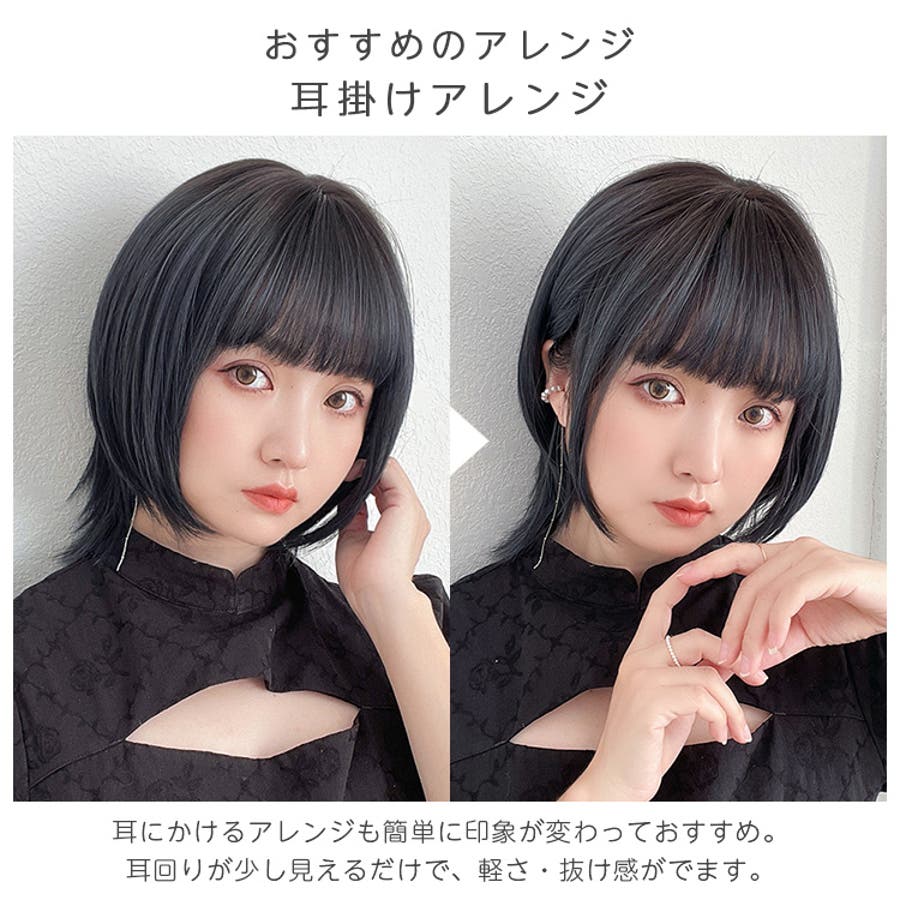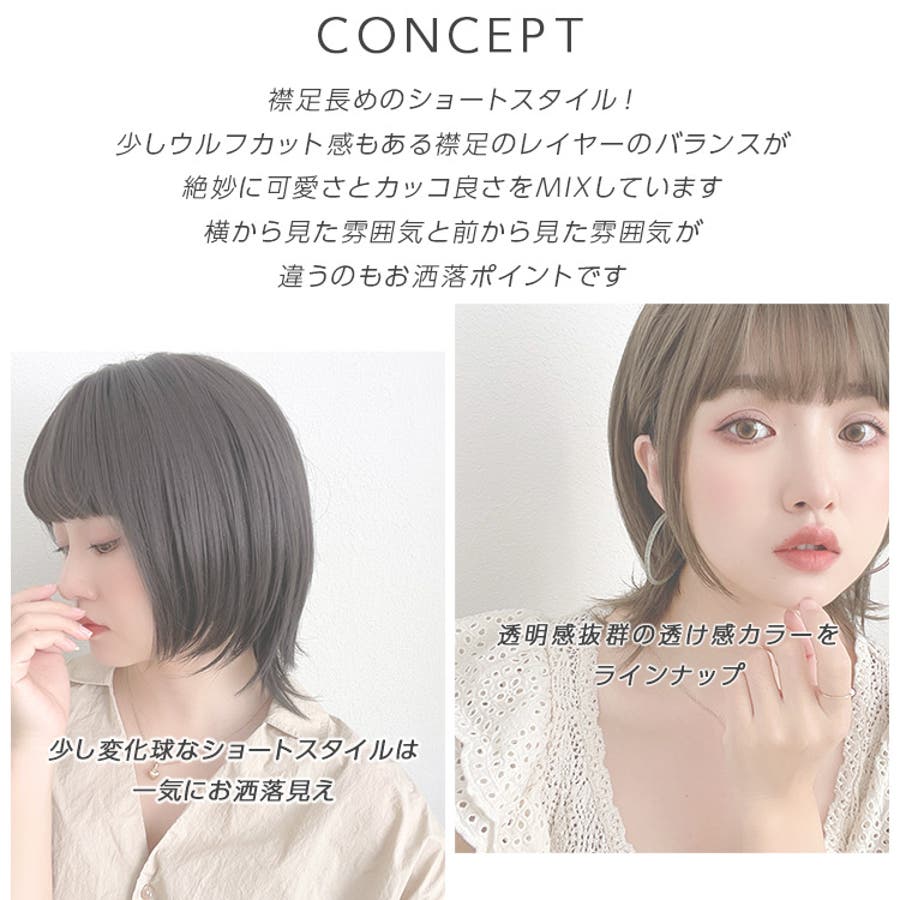 ショートヘアの短さに抵抗のある方も、これならトライしやすいはず!襟足が長めの作りなので、キュートな印象の中に、クールさも兼ね備えたお洒落なデザインです。顔回りのレイヤーは小顔効果もあり、耳にかけるアレンジもとっても素敵です。ショートにしてみたいけど、短すぎるのは気になる・・という方、重たい印象は嫌だな・・という方、ぜひ一度かぶってみてください。透明感抜群の透け感カラーを含む全6色展開です。