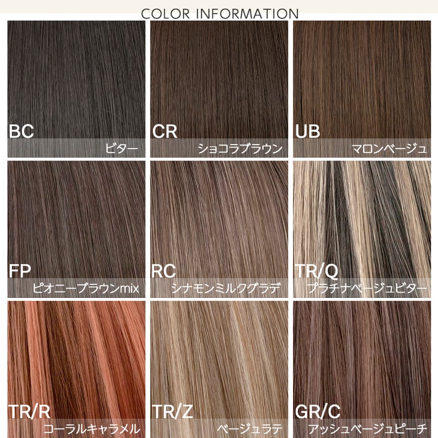 | カラー | BCビター / CRショコラブラウン / UBマロンベージュ / FPピオニーブラウンmix / RCシナモンミルクグラデ / TR/Qプラチナベージュビター / TR/Rコーラルキャラメル / TR/Zベージュラテ / GR/Cアッシュベージュピーチ |