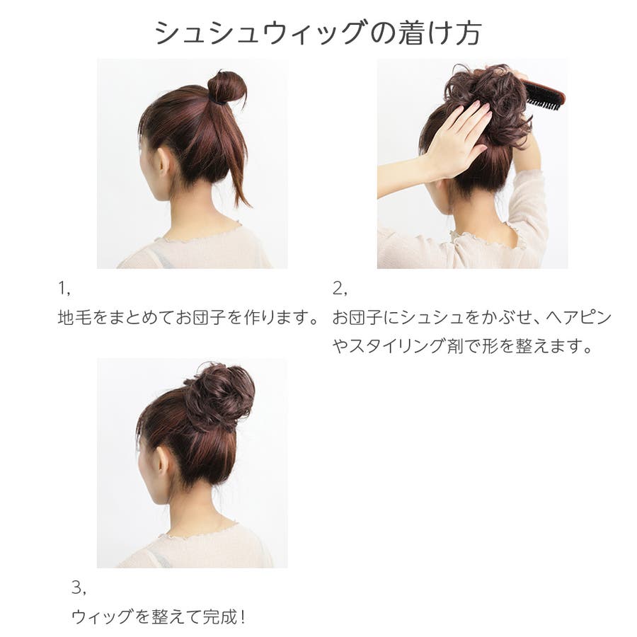 輪っかのゴムに髪の毛を巻き付けたシュシュタイプなのでご自身の地毛のお団子に被せるだけの簡単装着です。