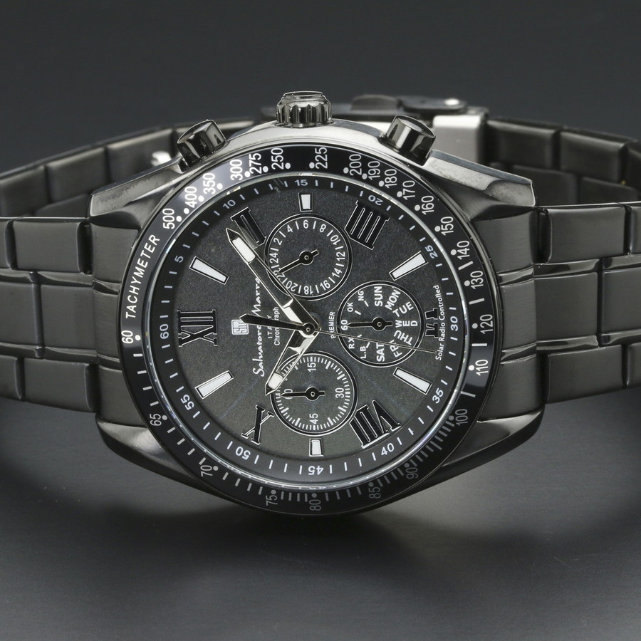 ■仕様:クォーツムーブメント(日本製)、電波ソーラー機能、5気圧防水、クロノグラフ(60分積算計、24時間計、曜日表示)