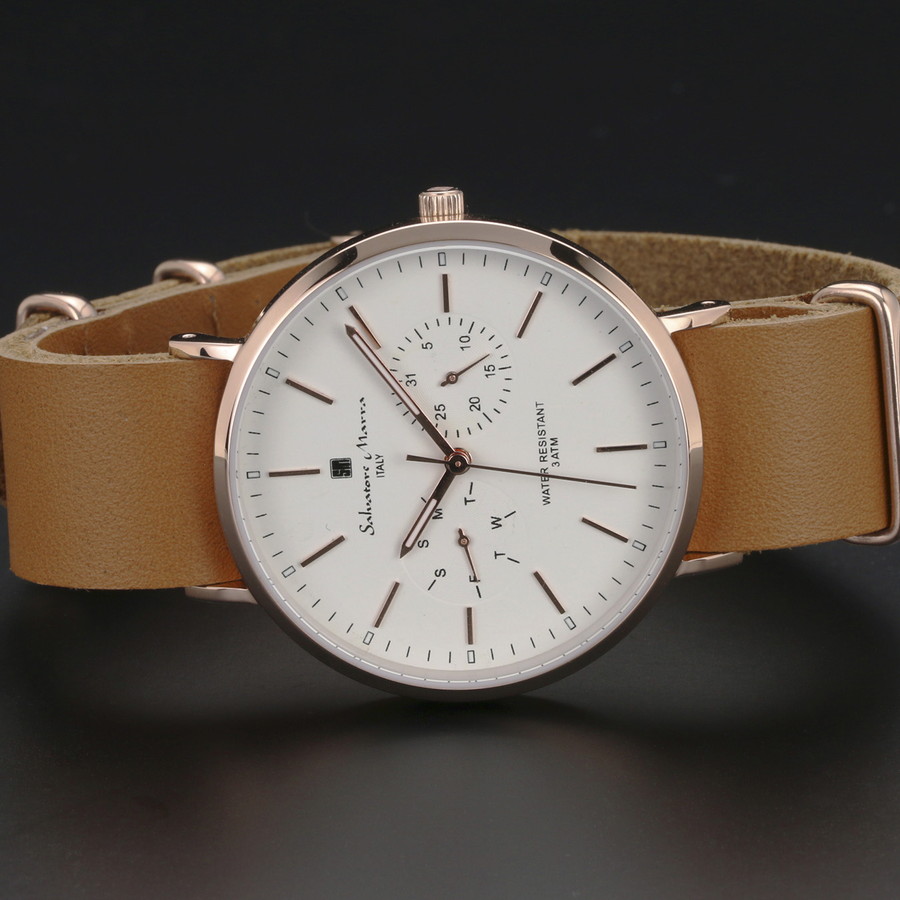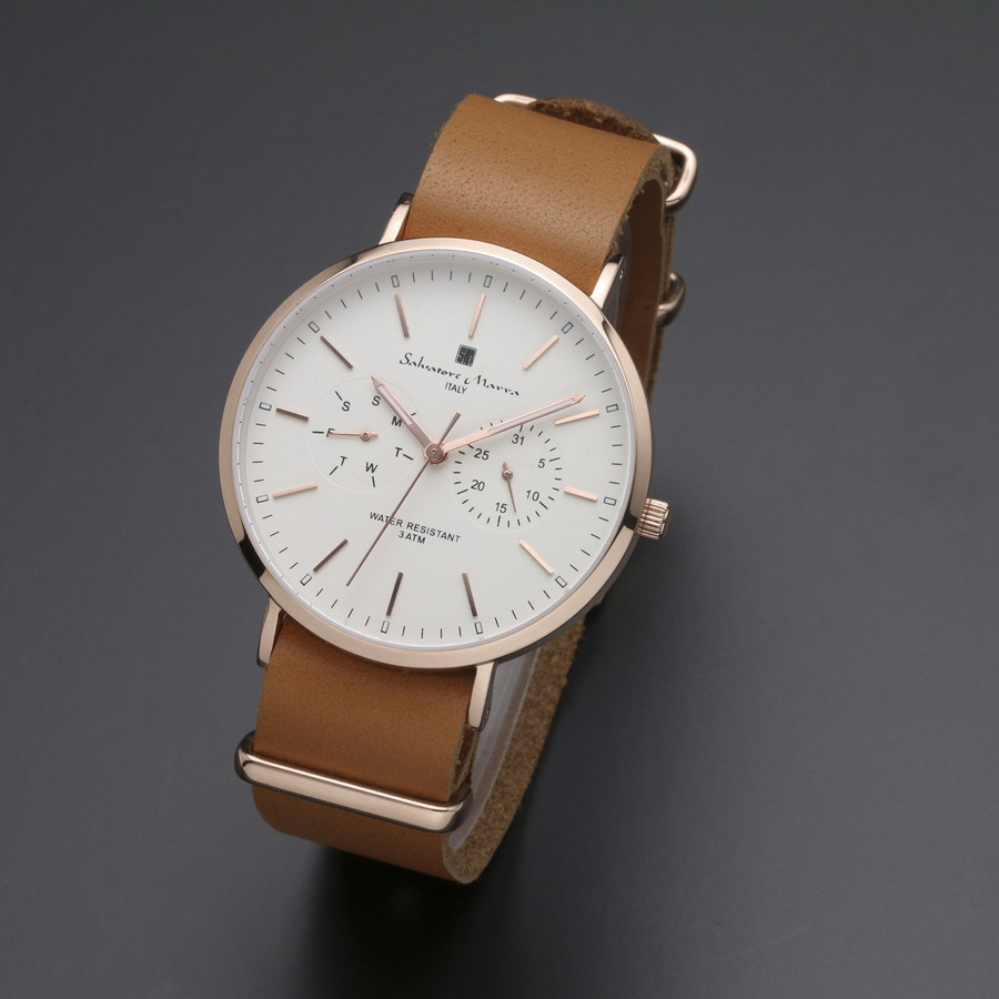 ■仕様:クォーツムーブメント(日本製)、月差±20秒、3気圧防水、曜日・日付表示