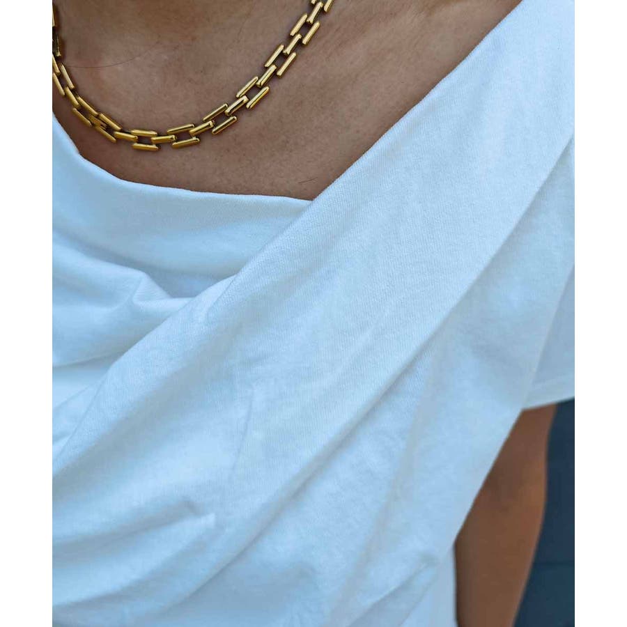・首元はやや広めでデコルテを綺麗に見せてくれるドレープデザイン