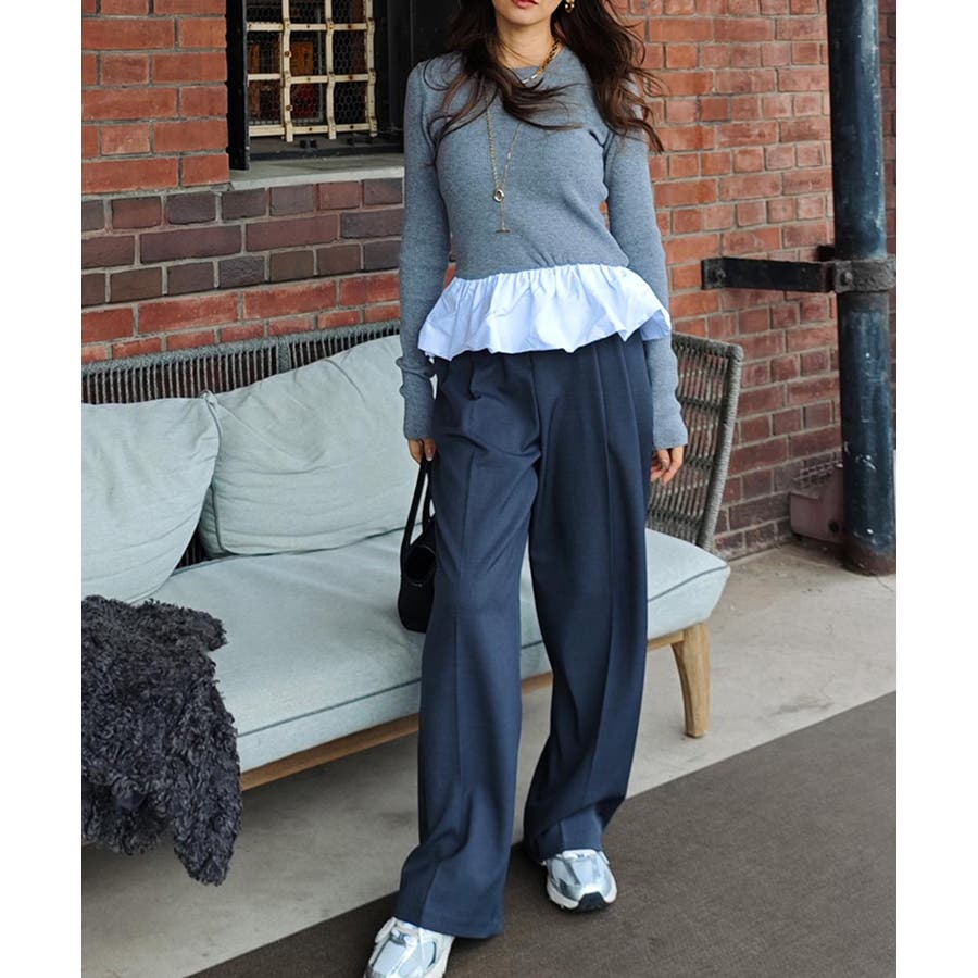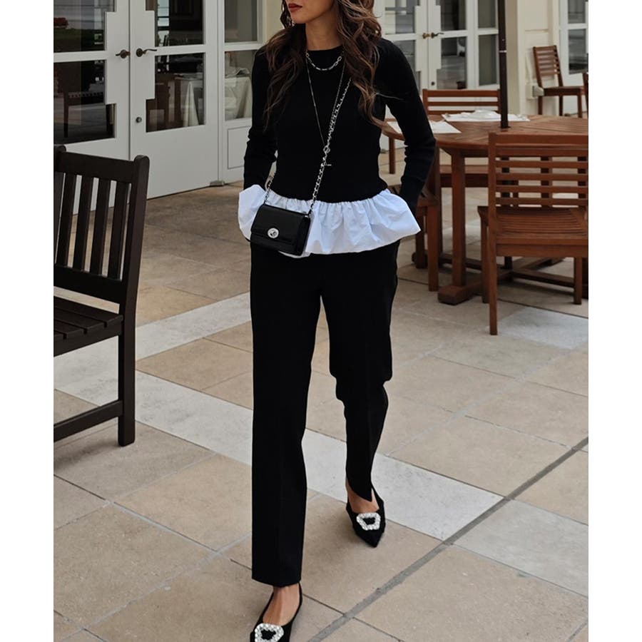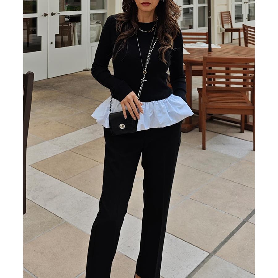 細身のボトムを合わせると、ぺプラムのボリューム感が際立つきれいめスタイルに。