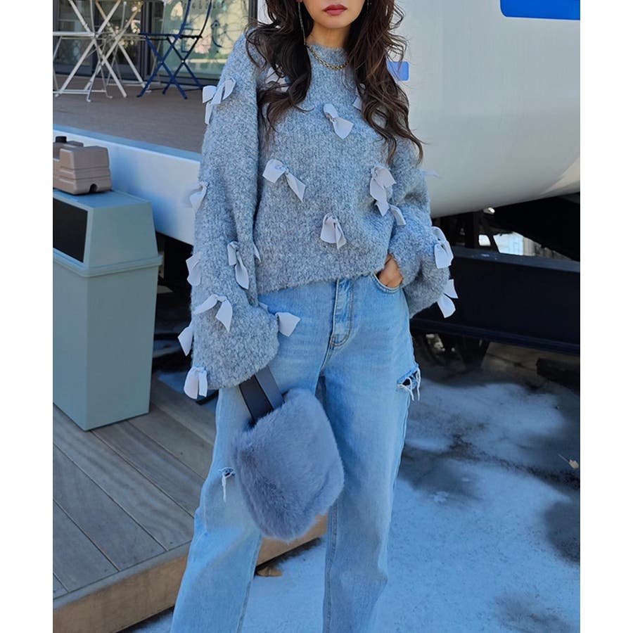 立体的で柔らかなリボンが、重くなりがちなニットに華やかさと抜け感をプラス。