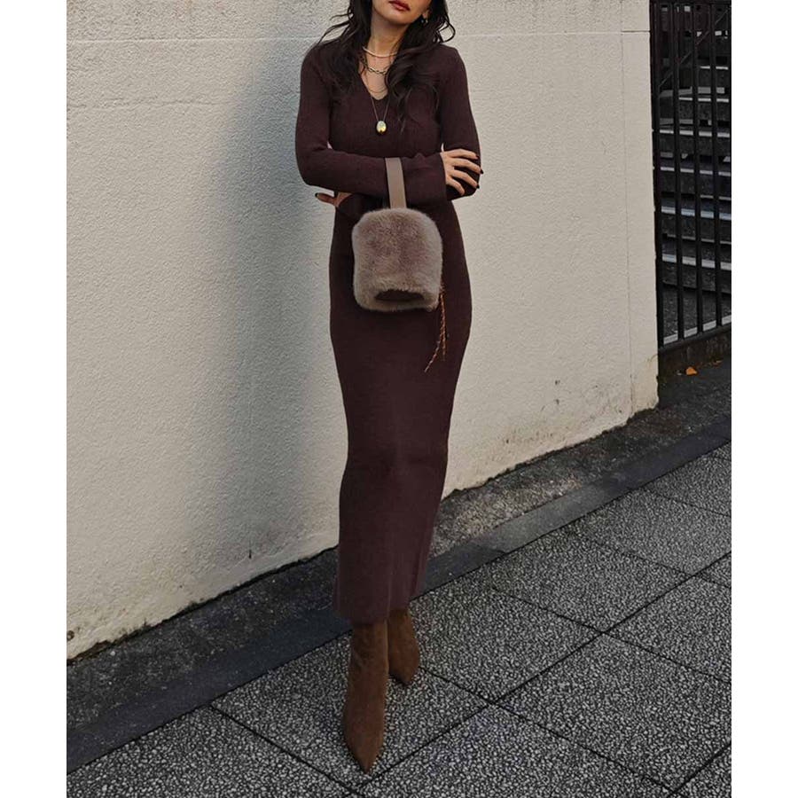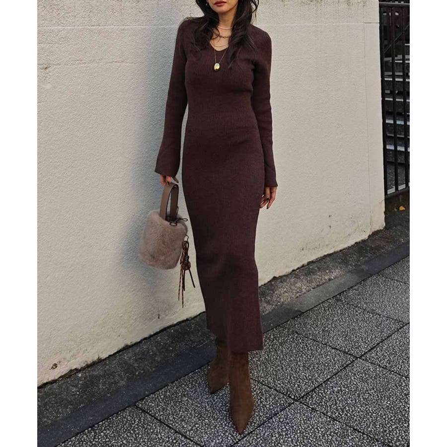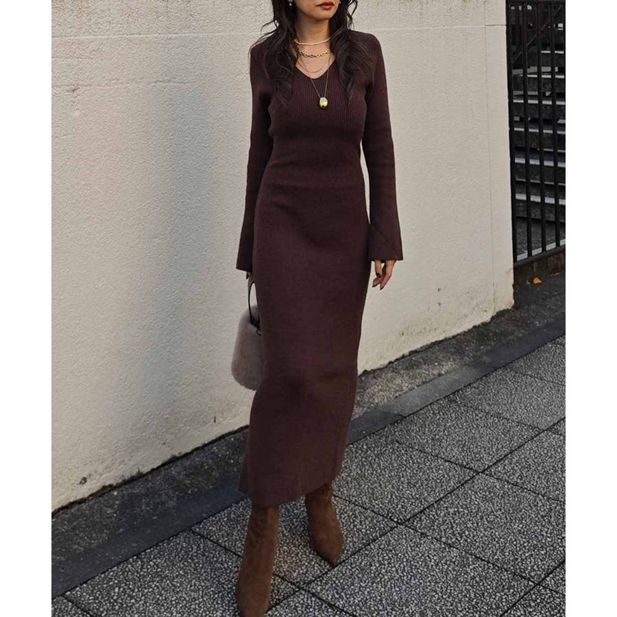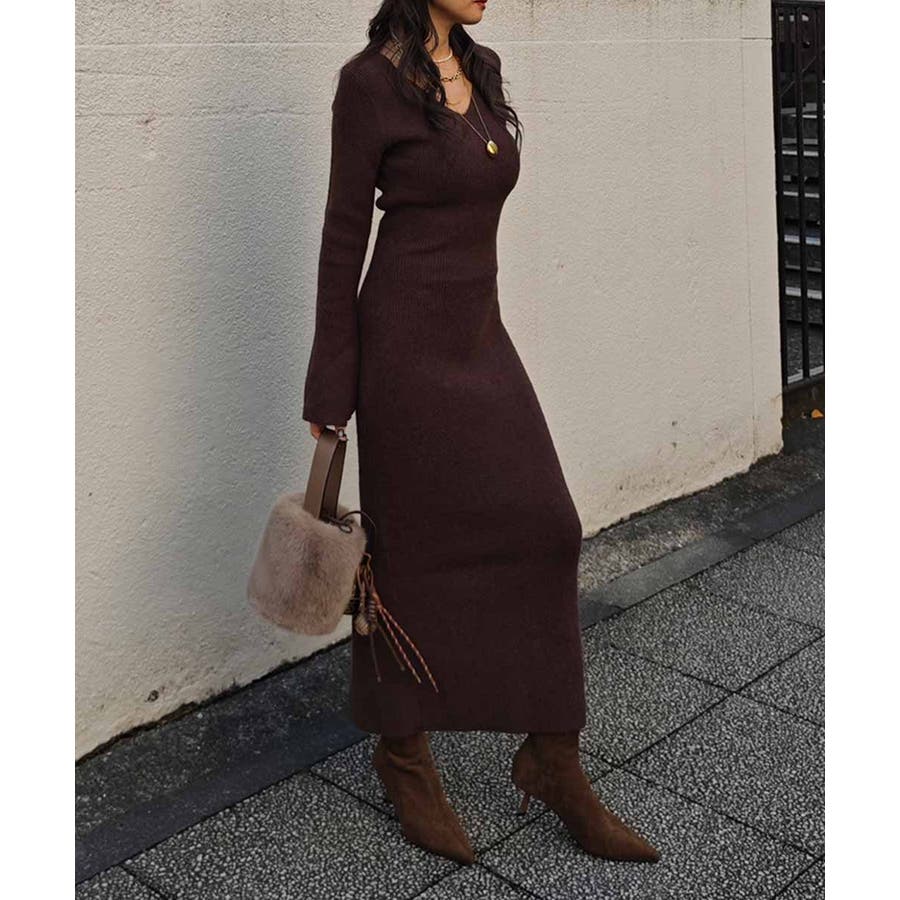 Vネックリブニットワンピースesutoreja ワンピース スタイルアップ