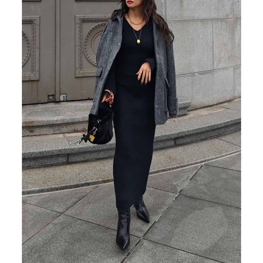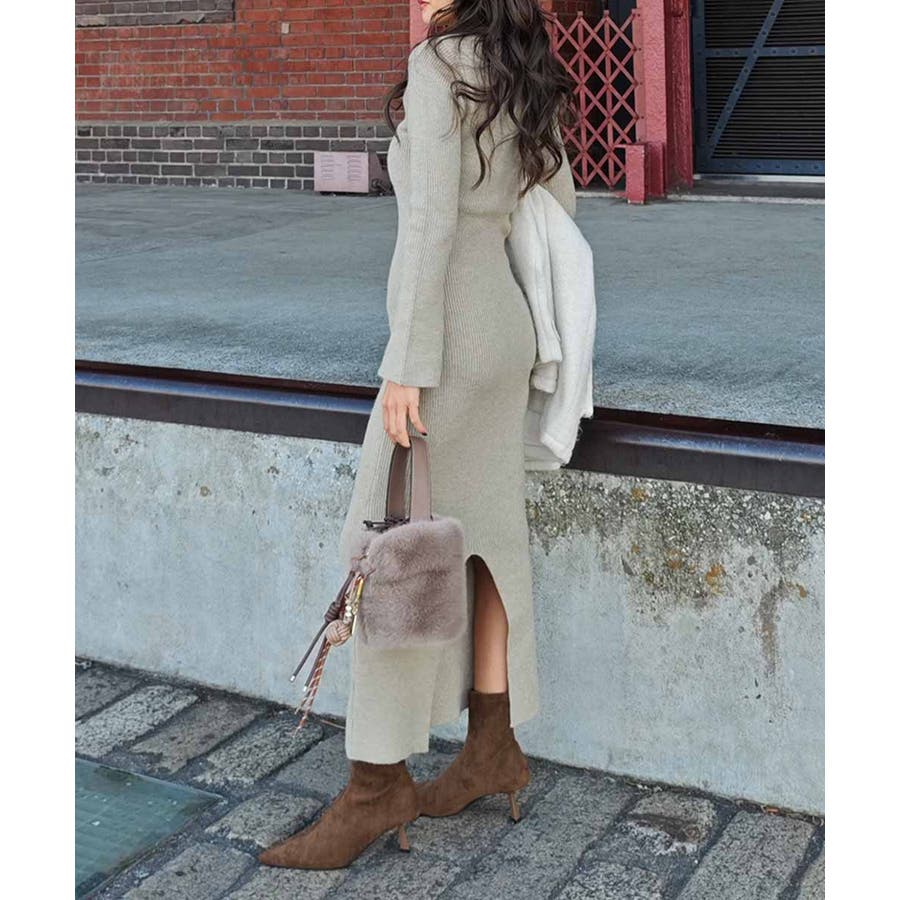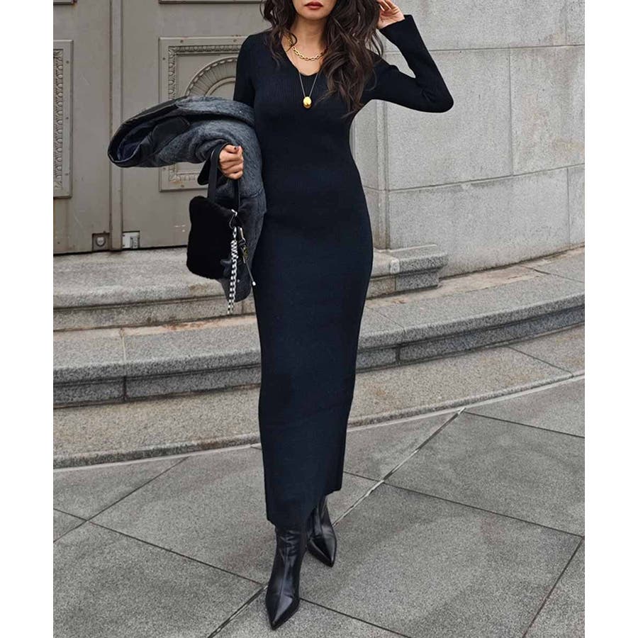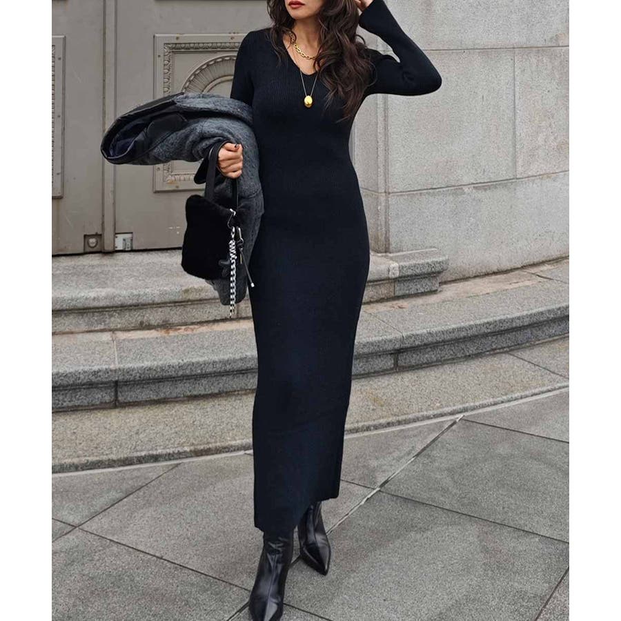 Vネックリブニットワンピースesutoreja ワンピース スタイルアップ