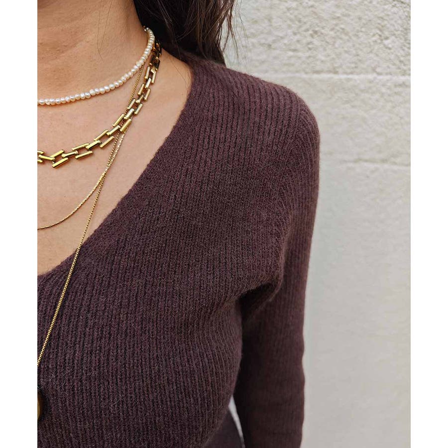程よい厚みのリブニット素材で伸縮性があり、ストレスフリーな着心地です。