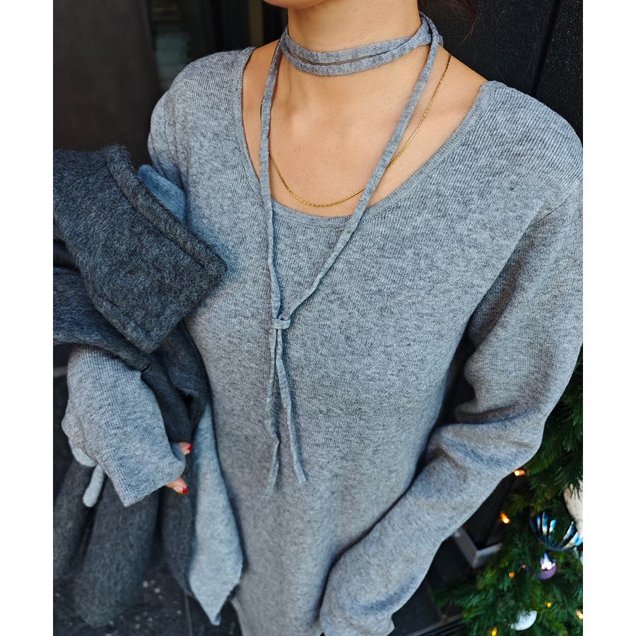 ネックのチョーカー紐がアクセントになったニットワンピース