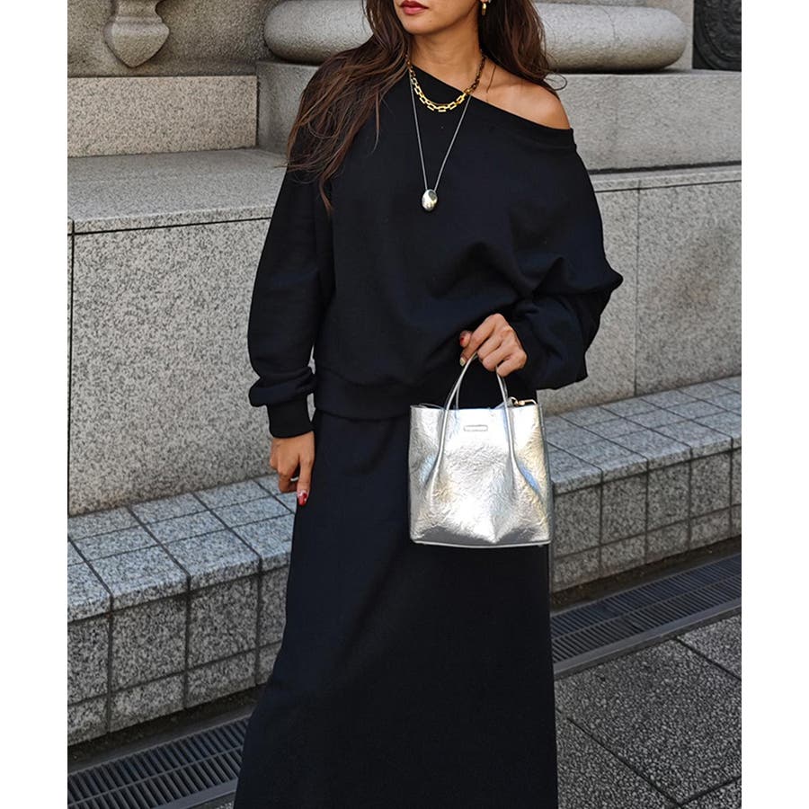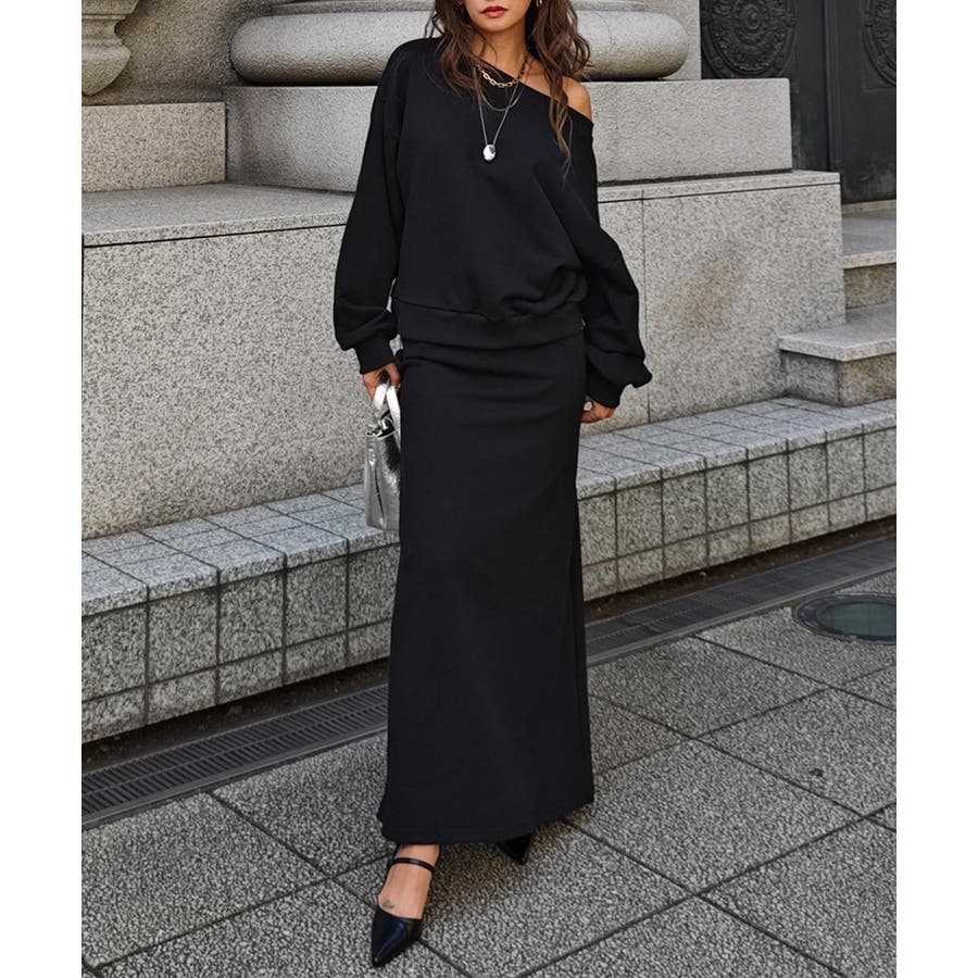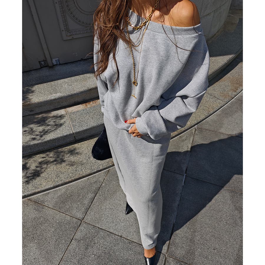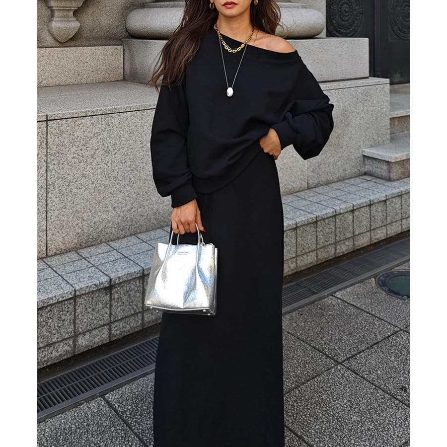 シンプルながらも女性らしさを引き立てるスウェット素材のセットアップ