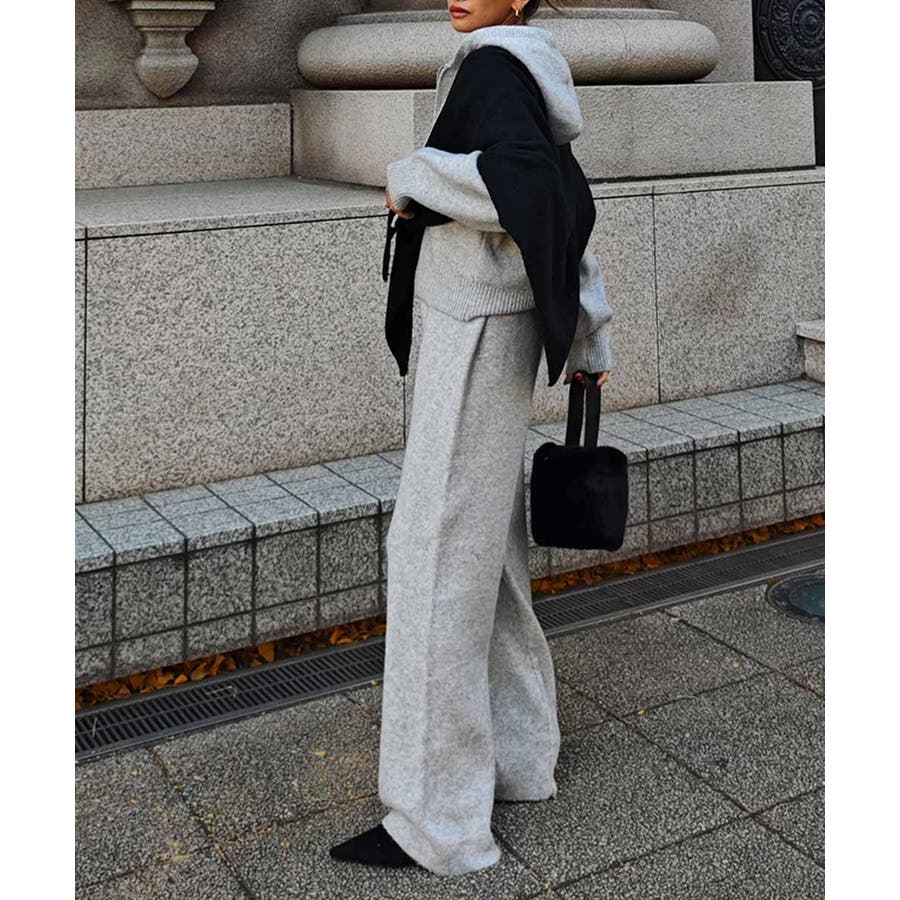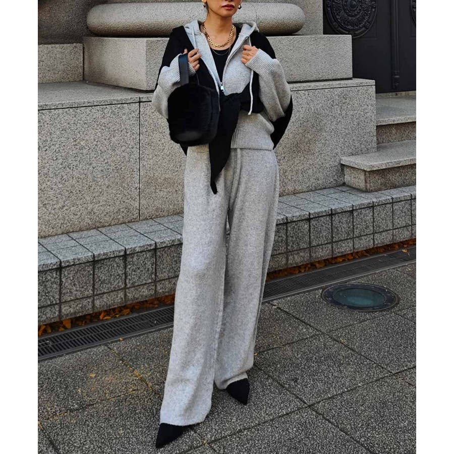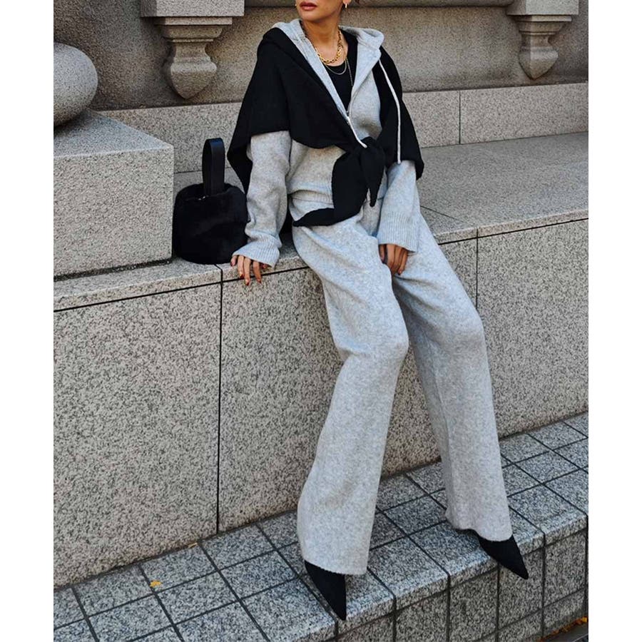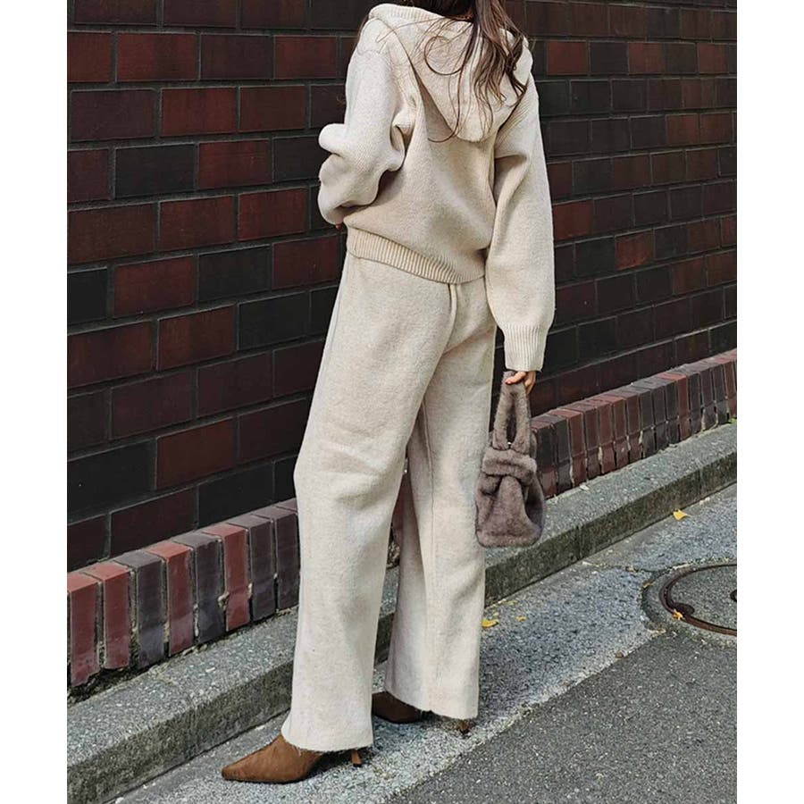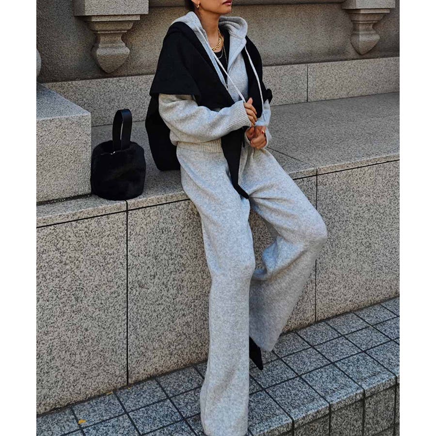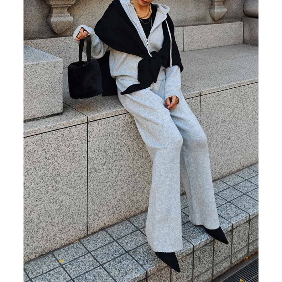 ふんわりと柔らかなニット素材のフーディとパンツのセットアップ