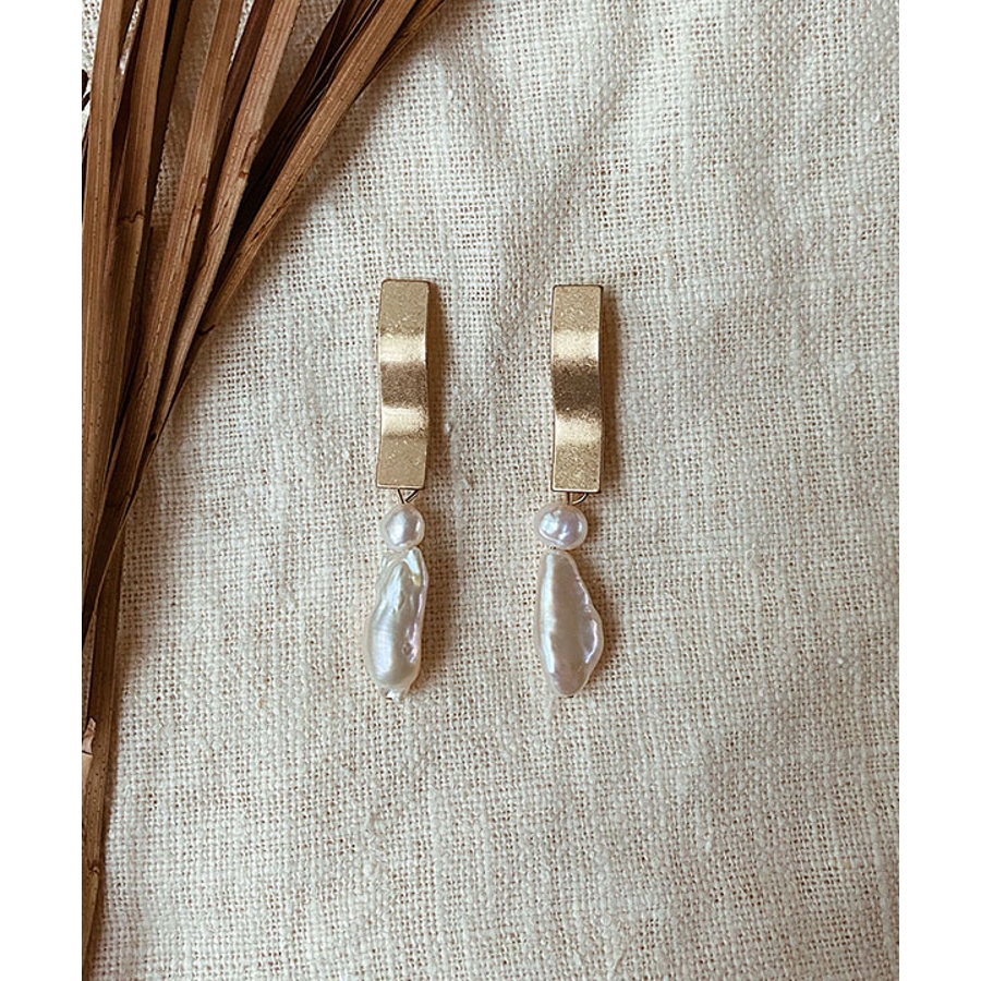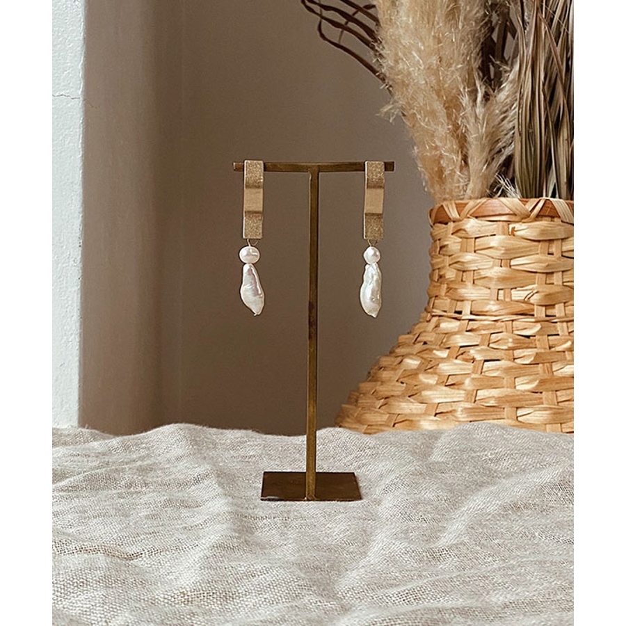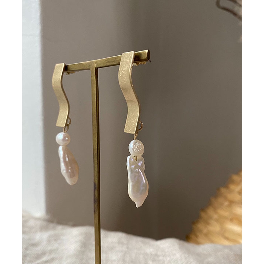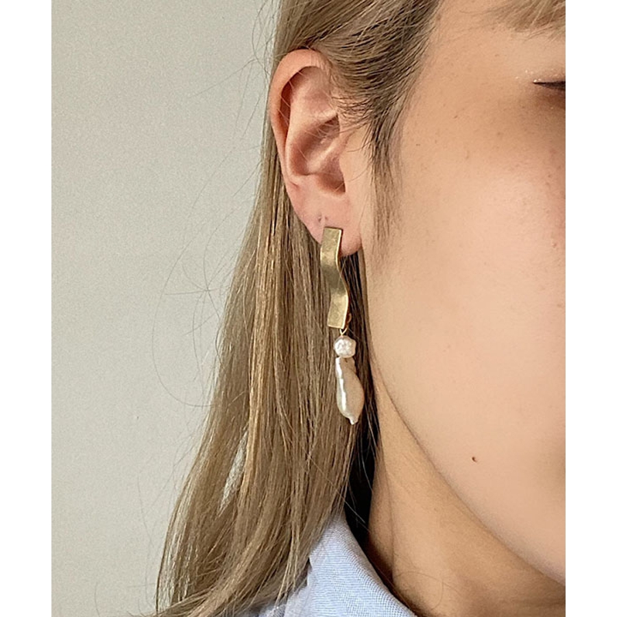 うねうねしたプレートとパールが2つ連なったデザイン性のあるピアス。