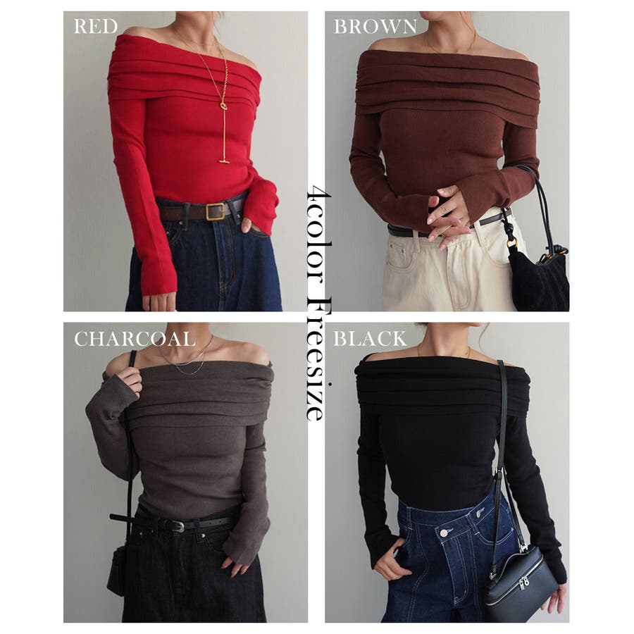 トレンド/スタイルアップ/体型カバー/定番/ベーシック/ナチュラル/カジュアル/大人カジュアル/きれいめカジュアル/シンプル/オフィス/オフィスカジュアル/デイリー/フォーマル/WEB限定/ニット/トップス/オフショルダー/オフショル/ギャザー/赤ニット/ヘルシー/肌見せ/抜け感/デコルテ映え/鎖骨映え/クラシカル/ロングスリーブ/長袖/長袖ニット
