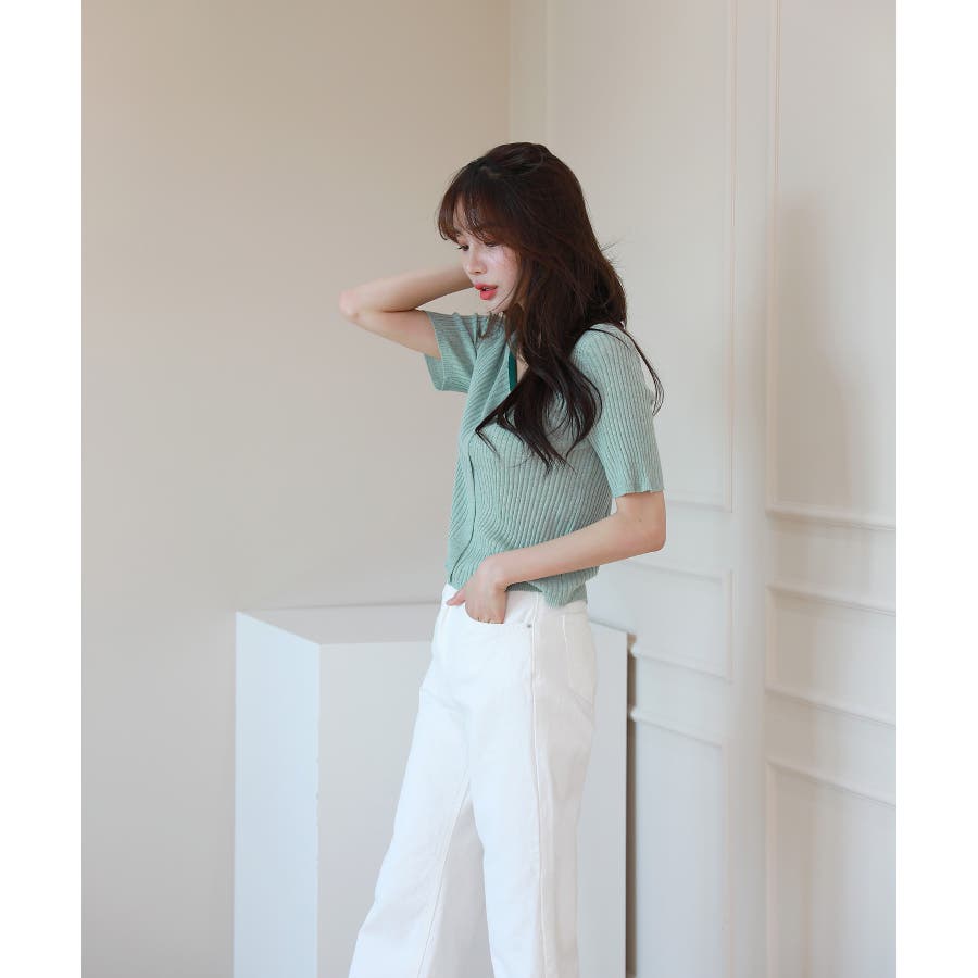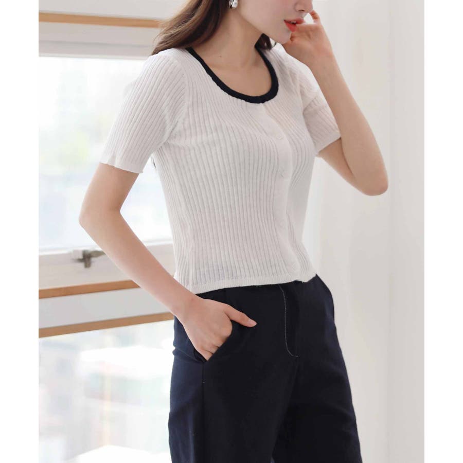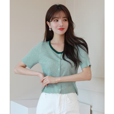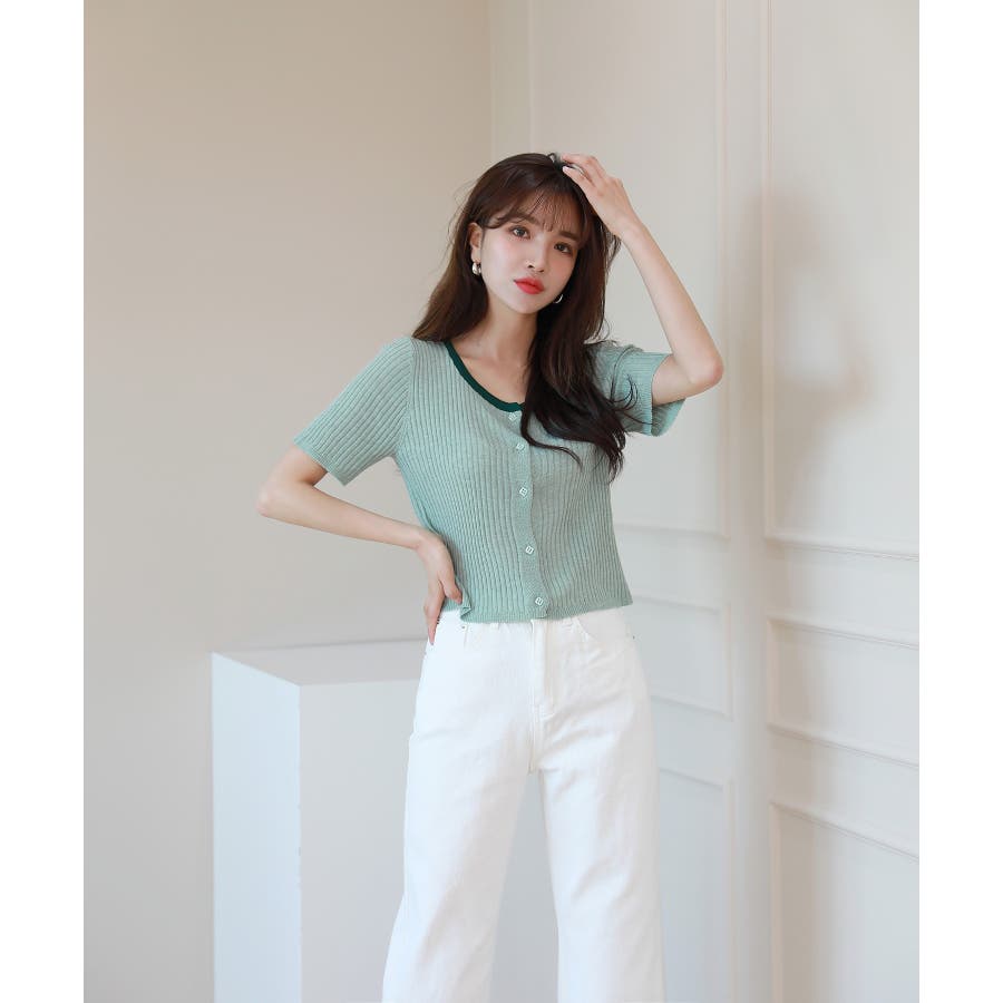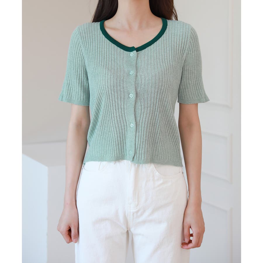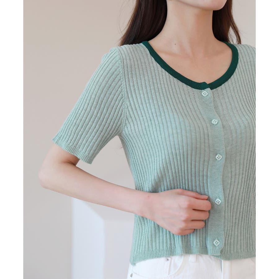 ベーシックなデザインでトレンディなカラーの半袖リブカーディガンです。