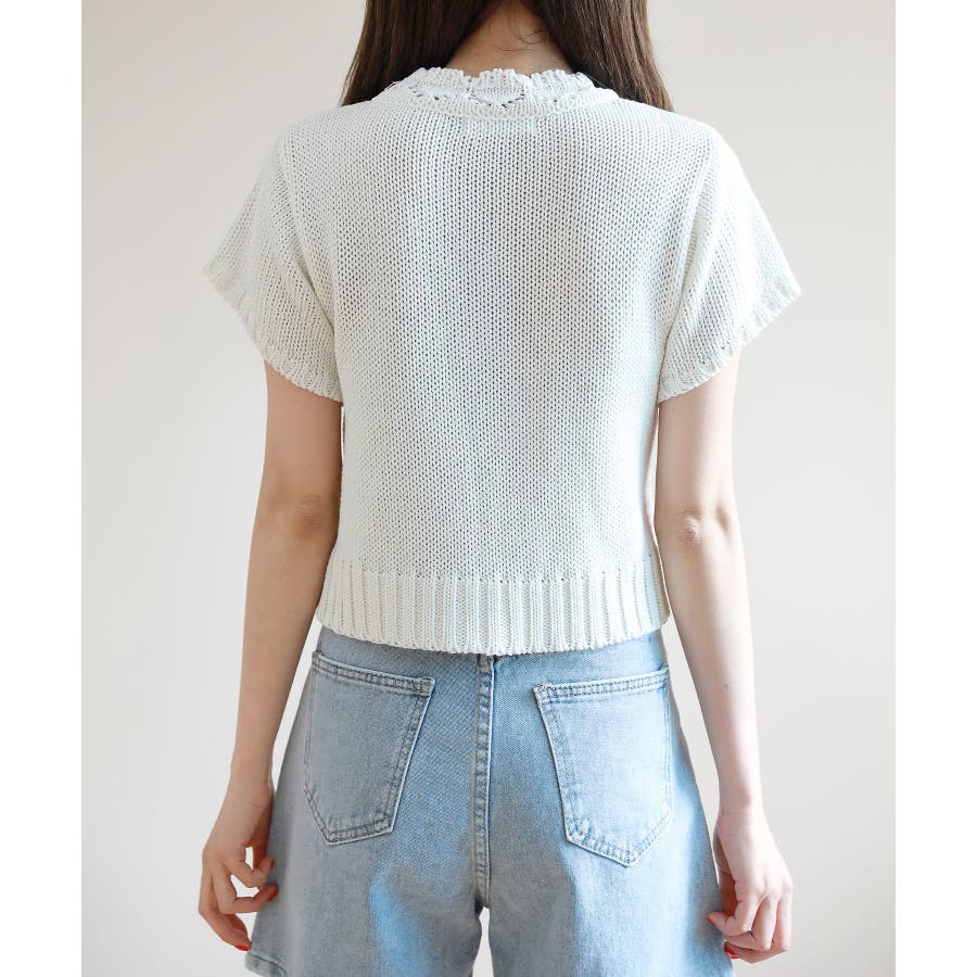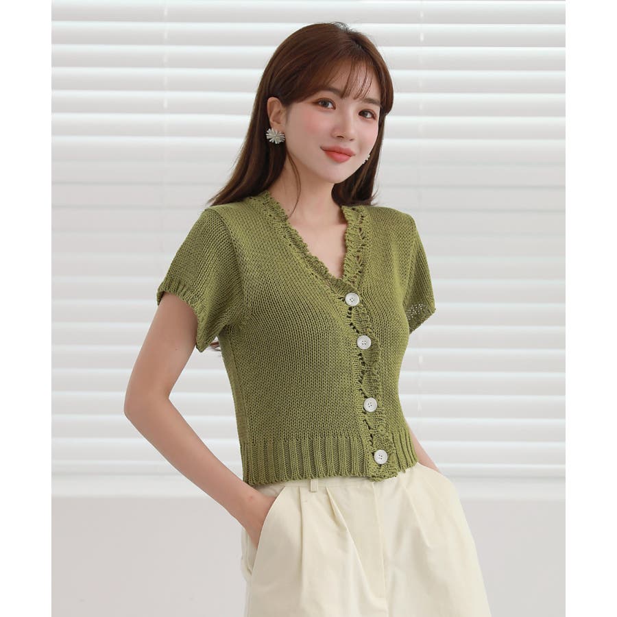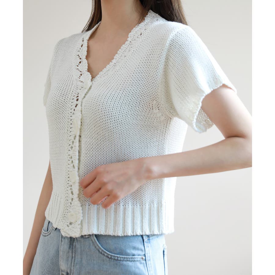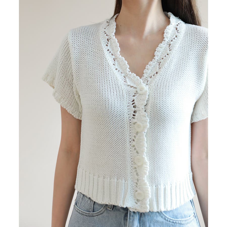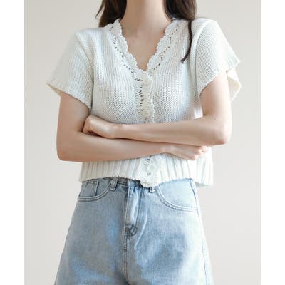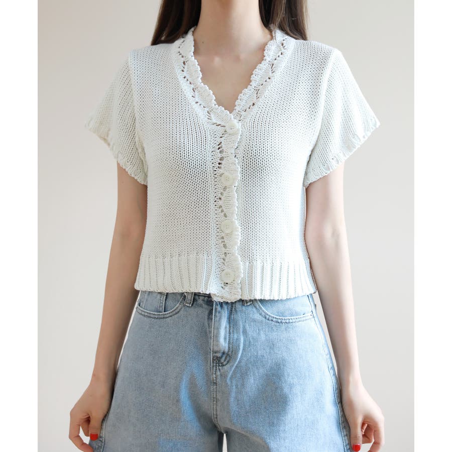 レースパンチングVネック半袖クロップドニットカーディガン