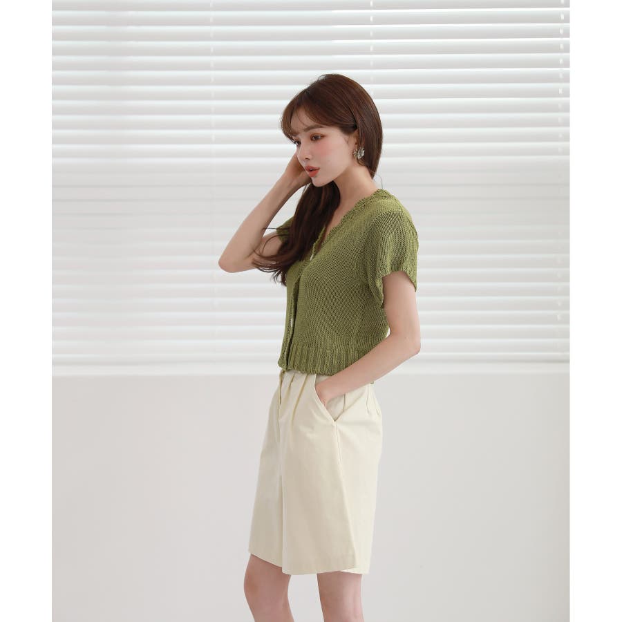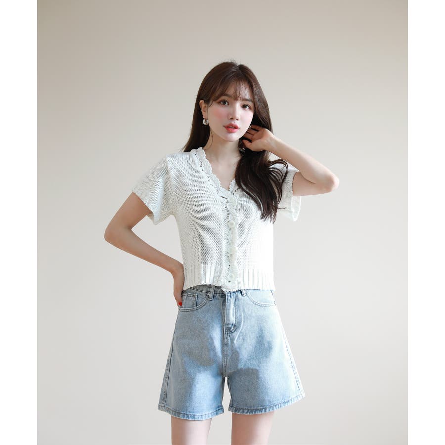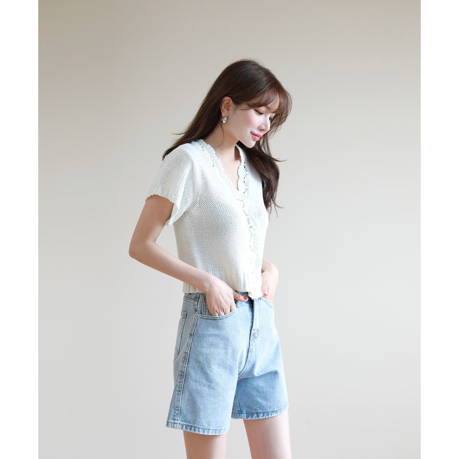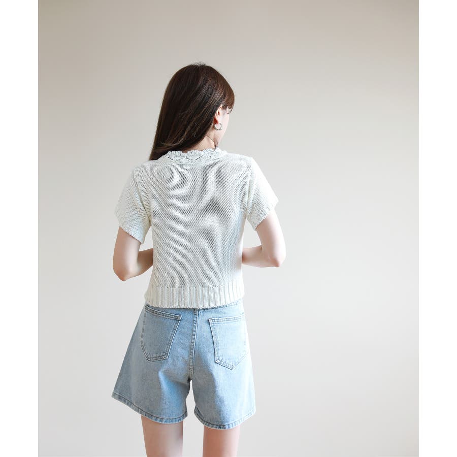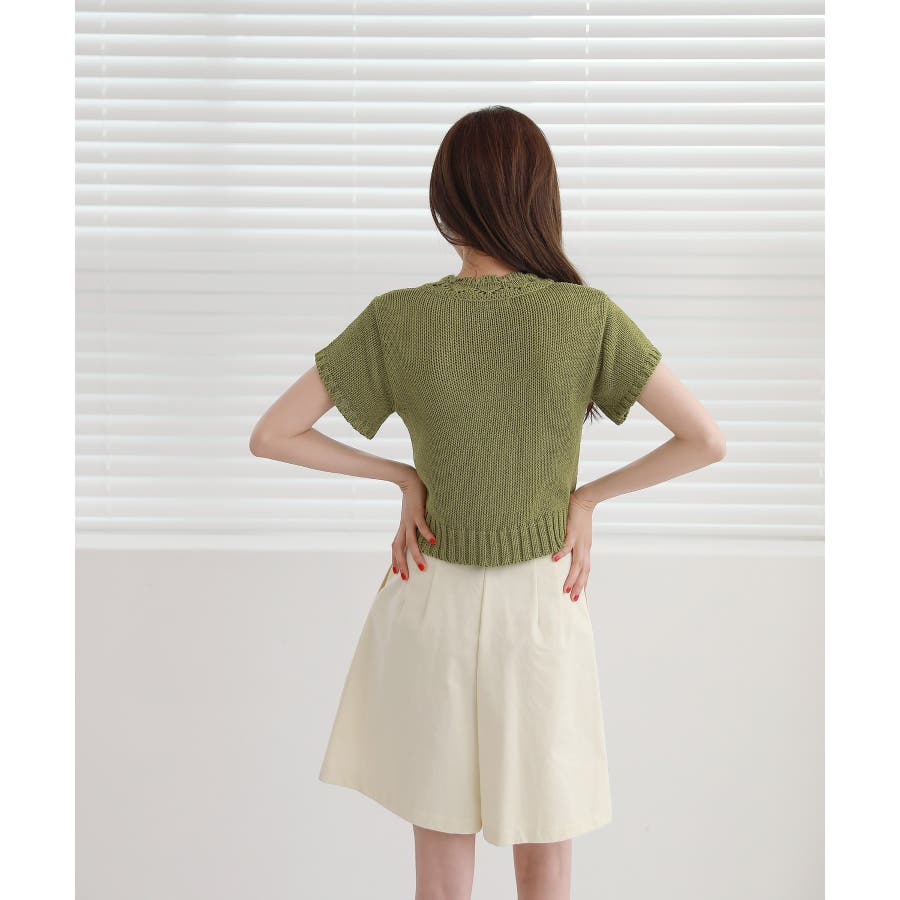 レースパンチングVネック半袖クロップドニットカーディガン