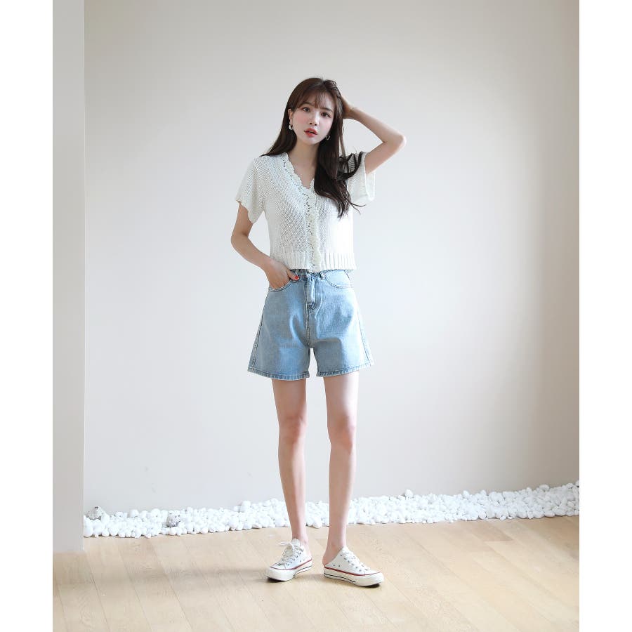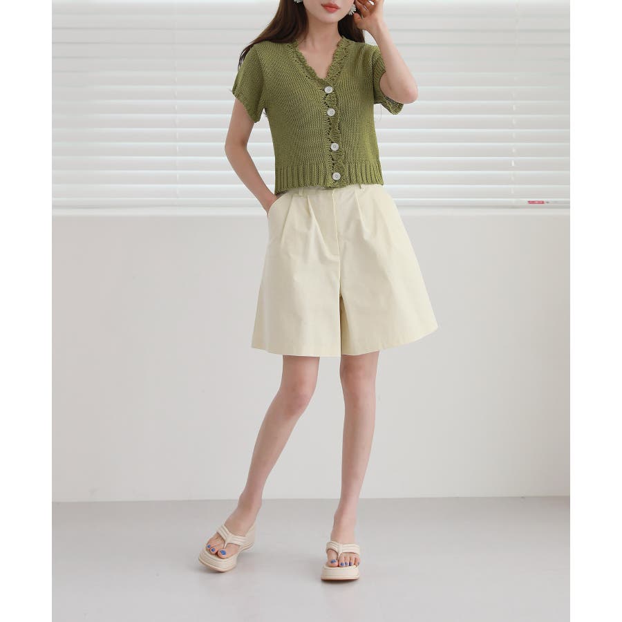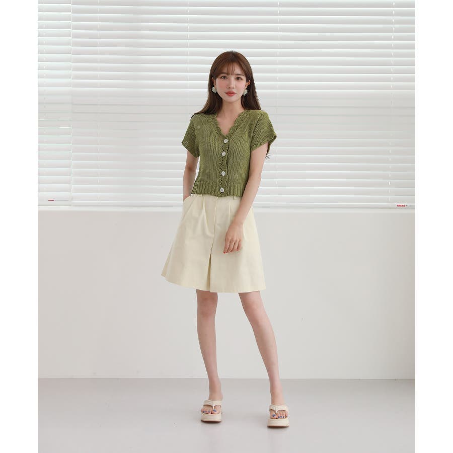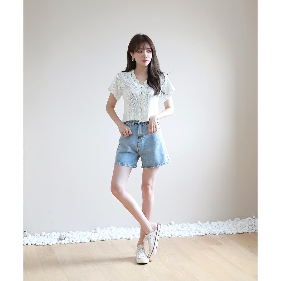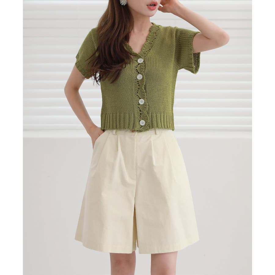 レースパンチングVネック半袖クロップドニットカーディガン