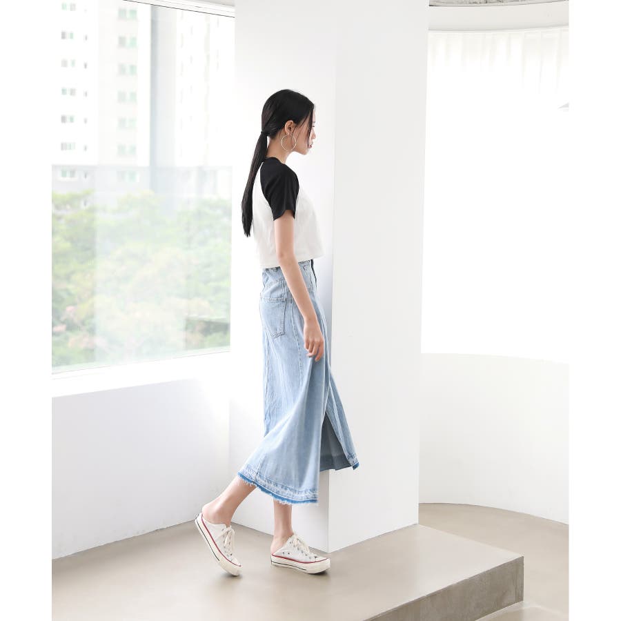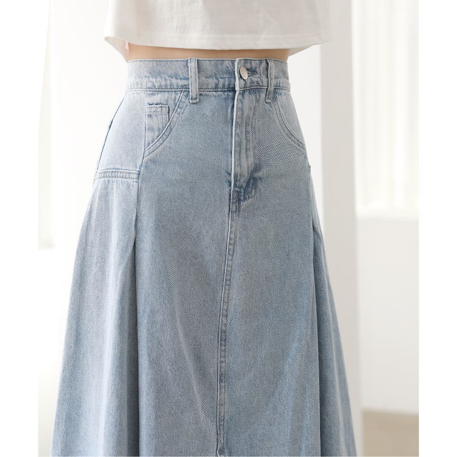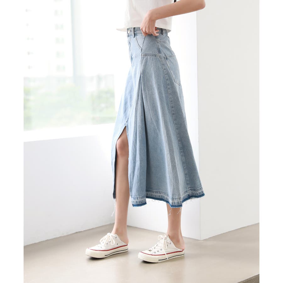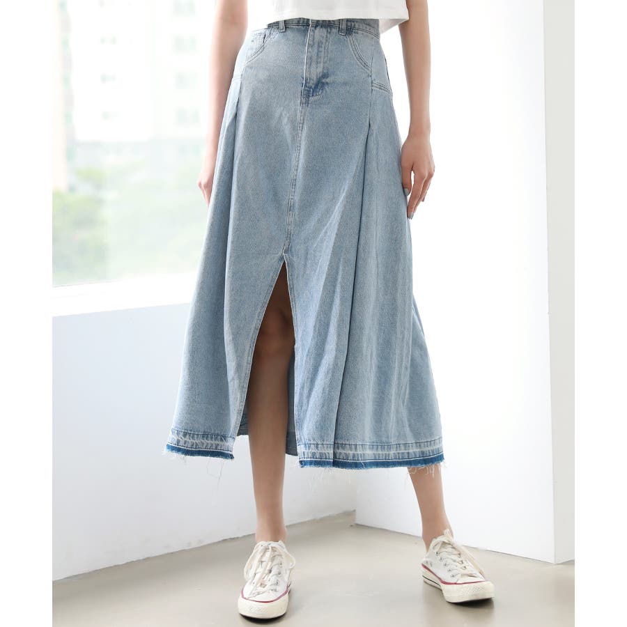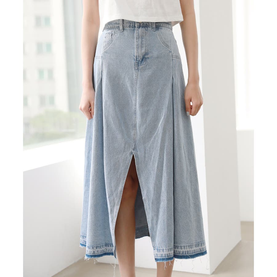 トレンディ ピンタック スリット デニム ロング スカート