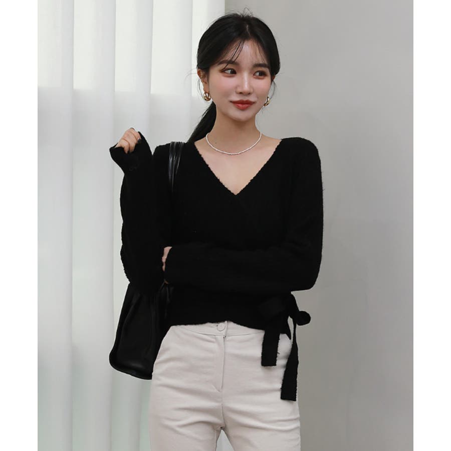 サイドストラップで締めれるのがポイントで、胸部はボタンで固定可能です。Vネックデザインでフェイスラインがすっきり綺麗に見えます。