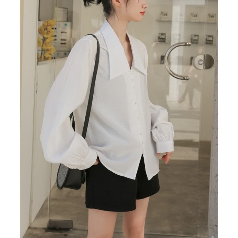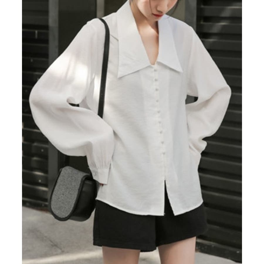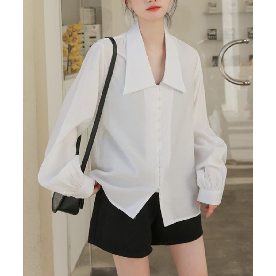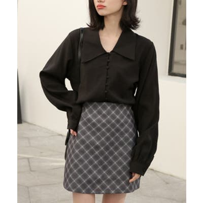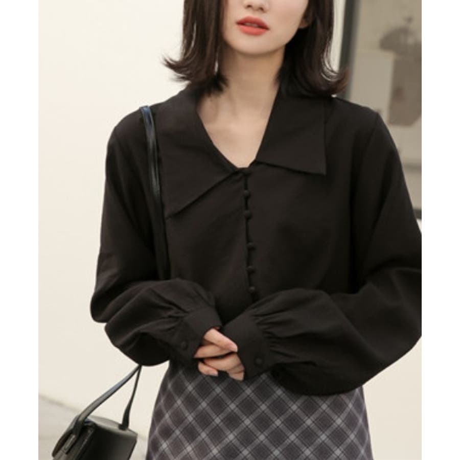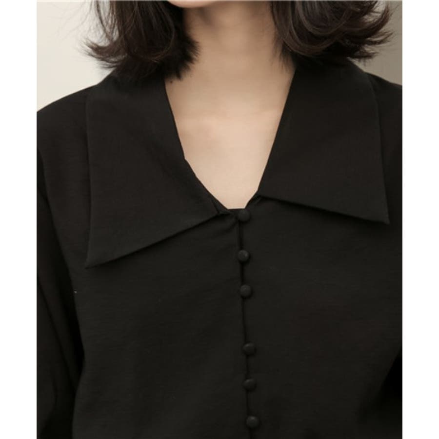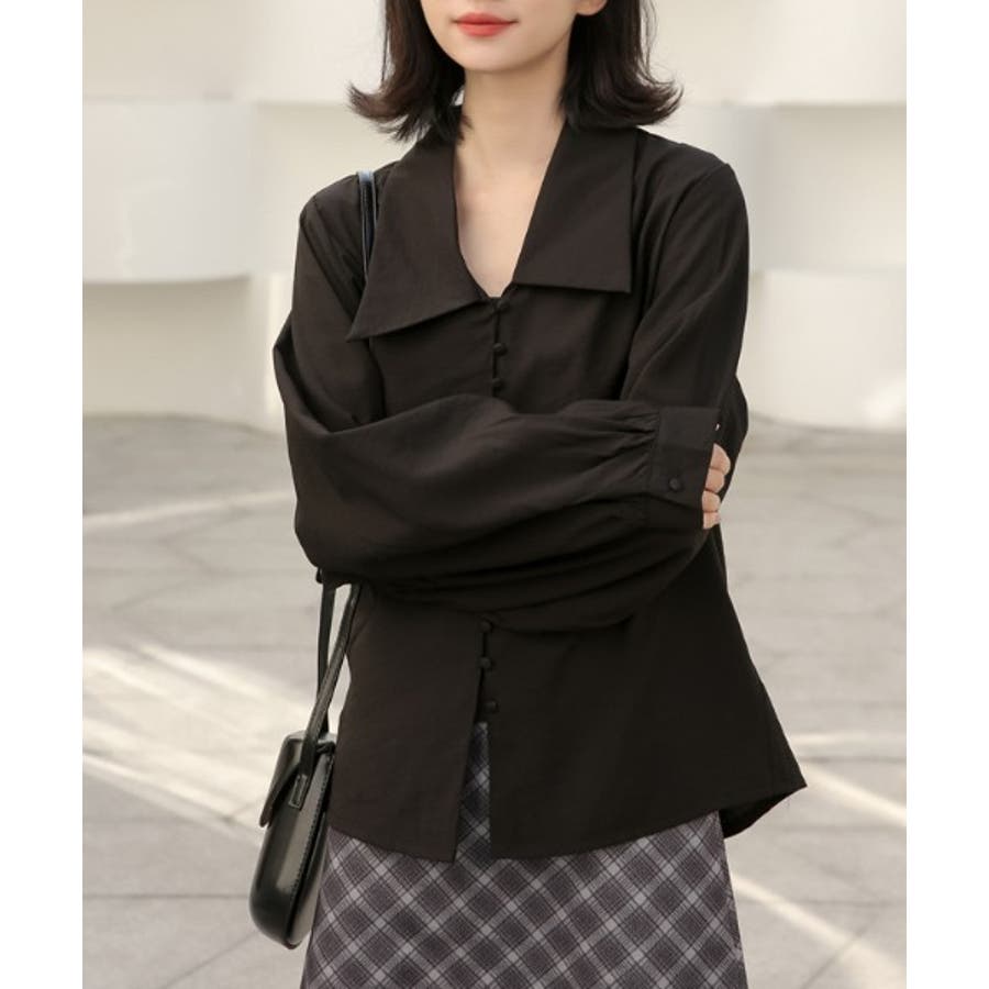 スタイリッシュな雰囲気で、襟部分とボタン仕様がお洒落なブラウスです:)