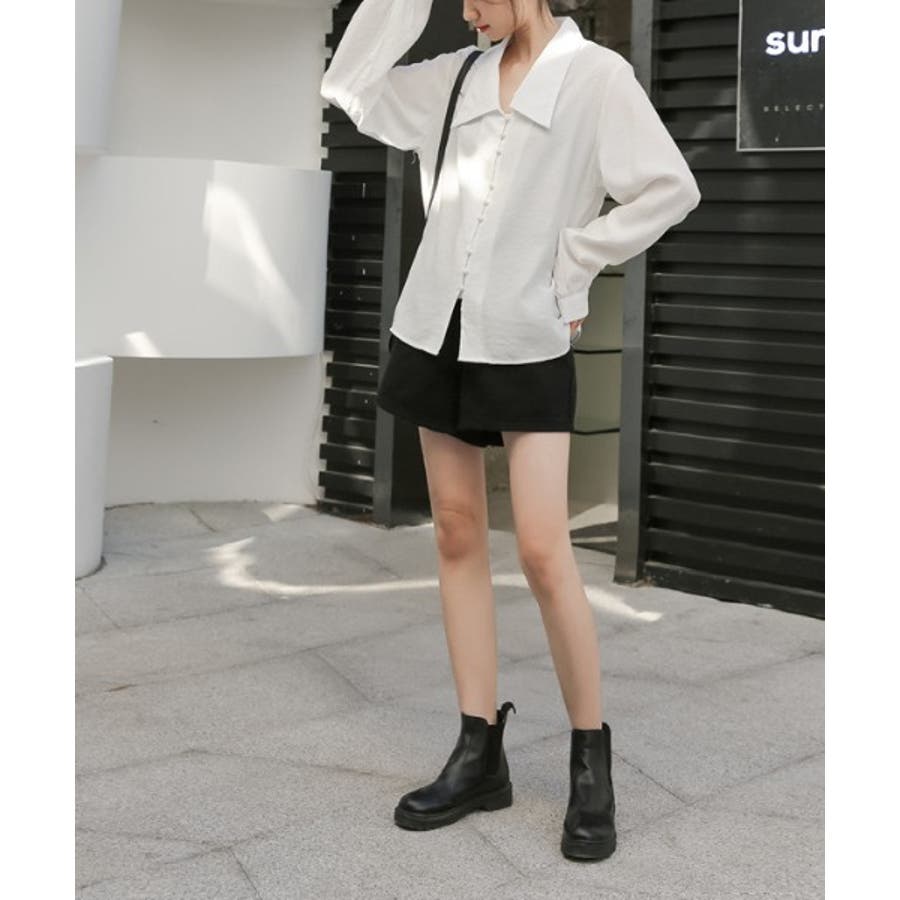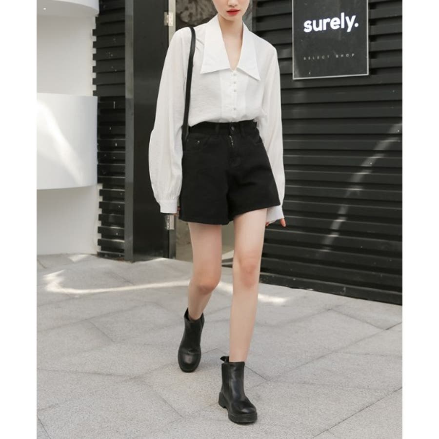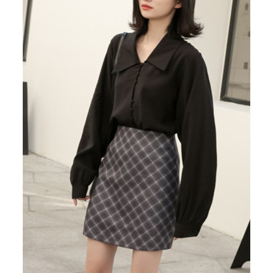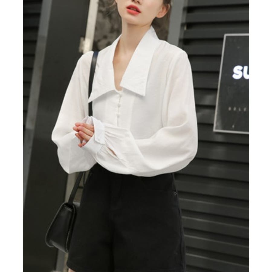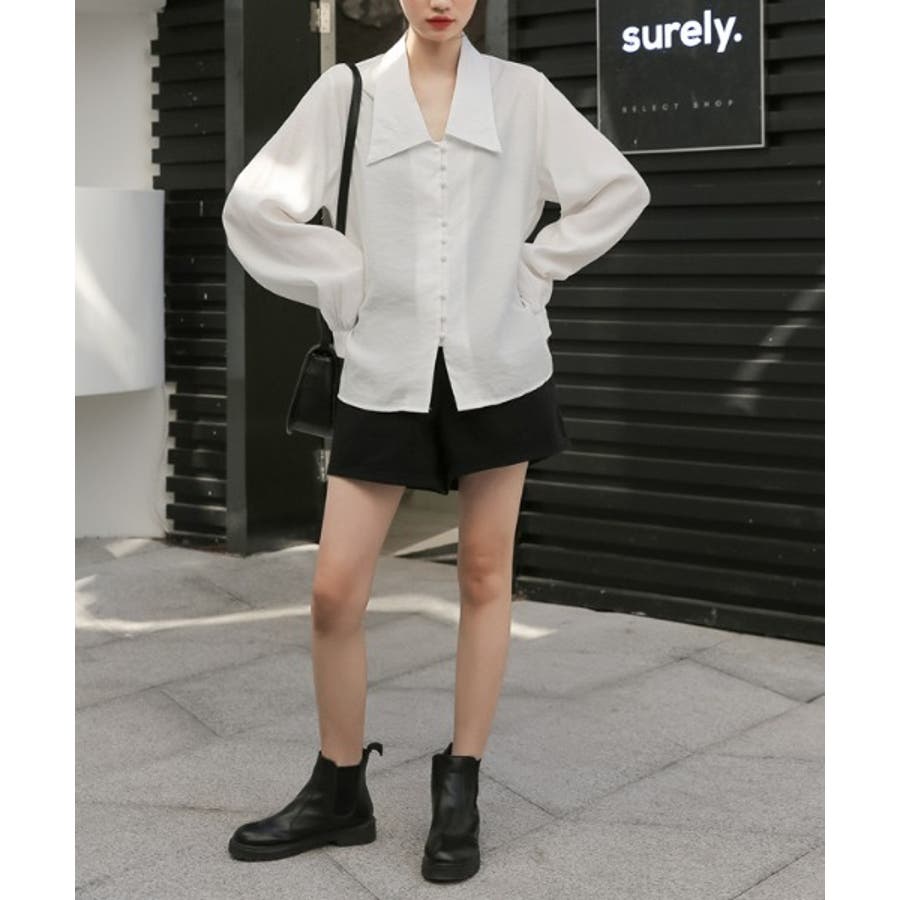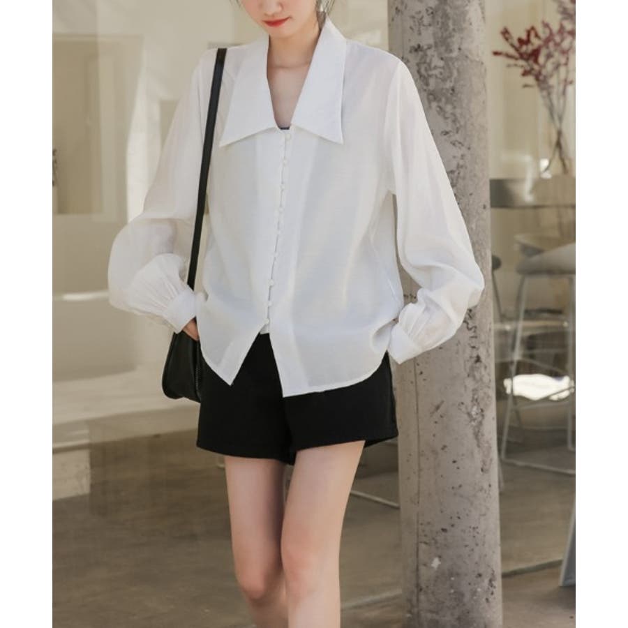 スタイリッシュな雰囲気で、襟部分とボタン仕様がお洒落なブラウスです:)