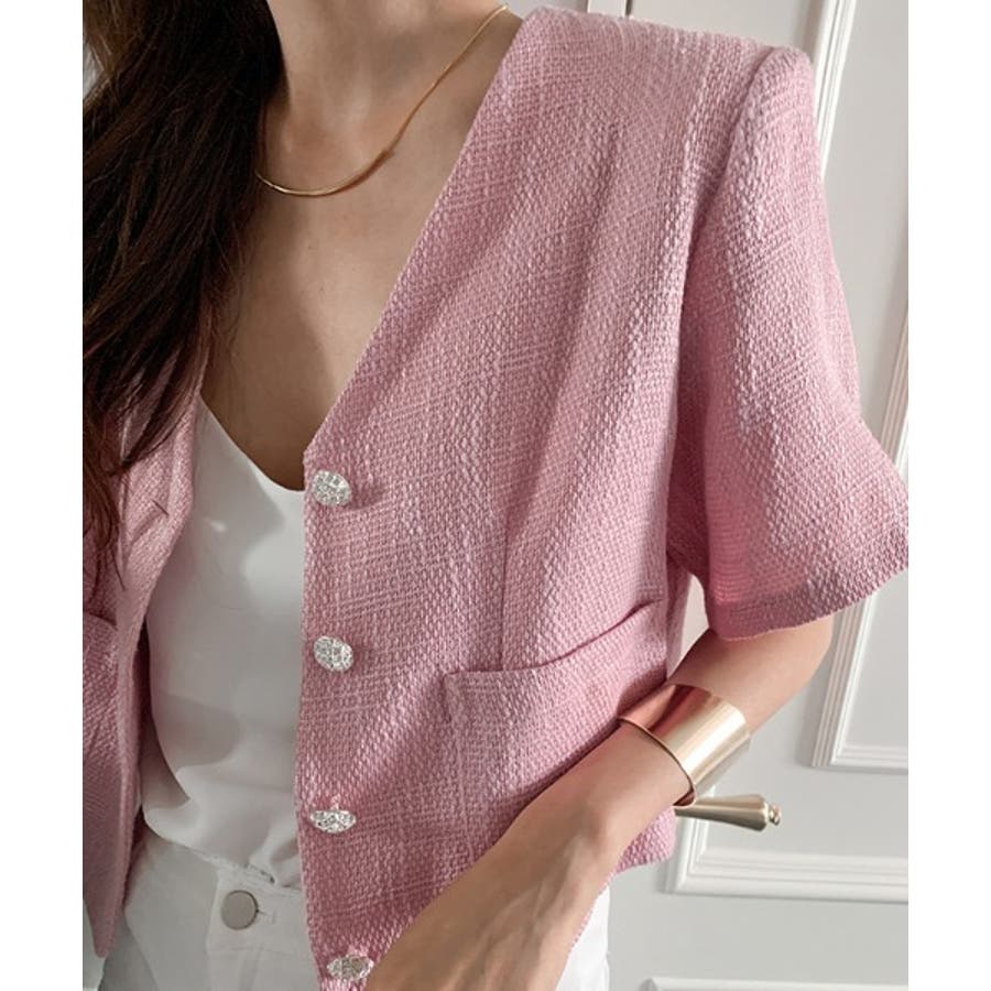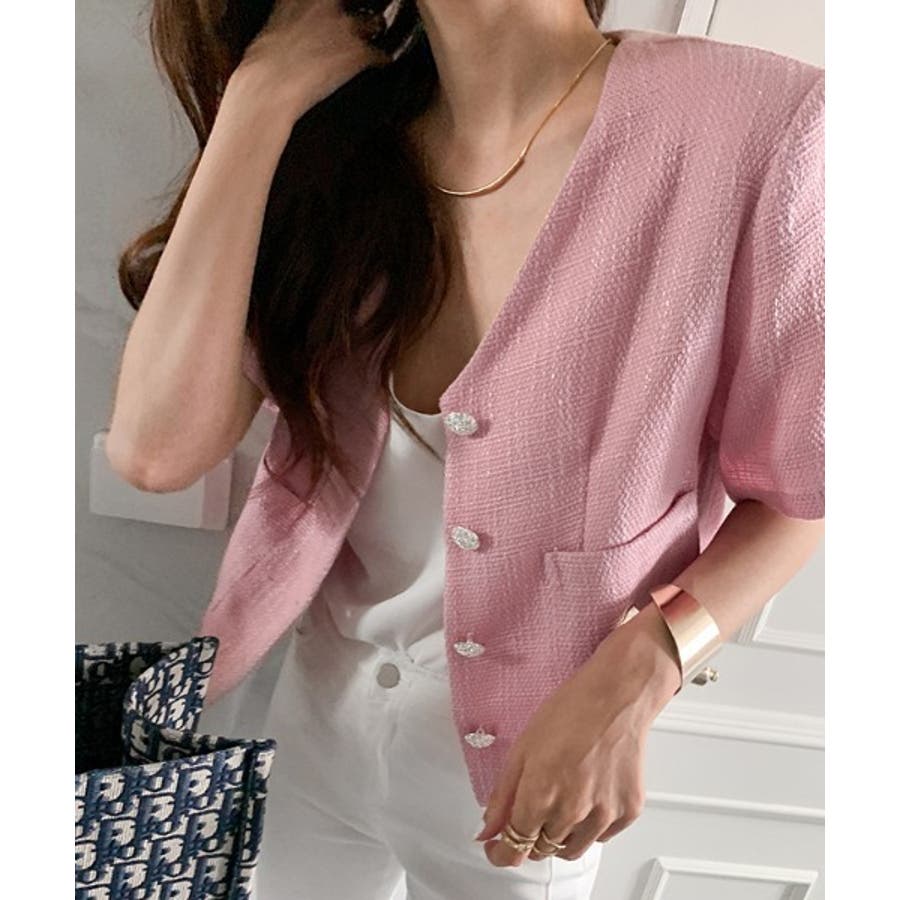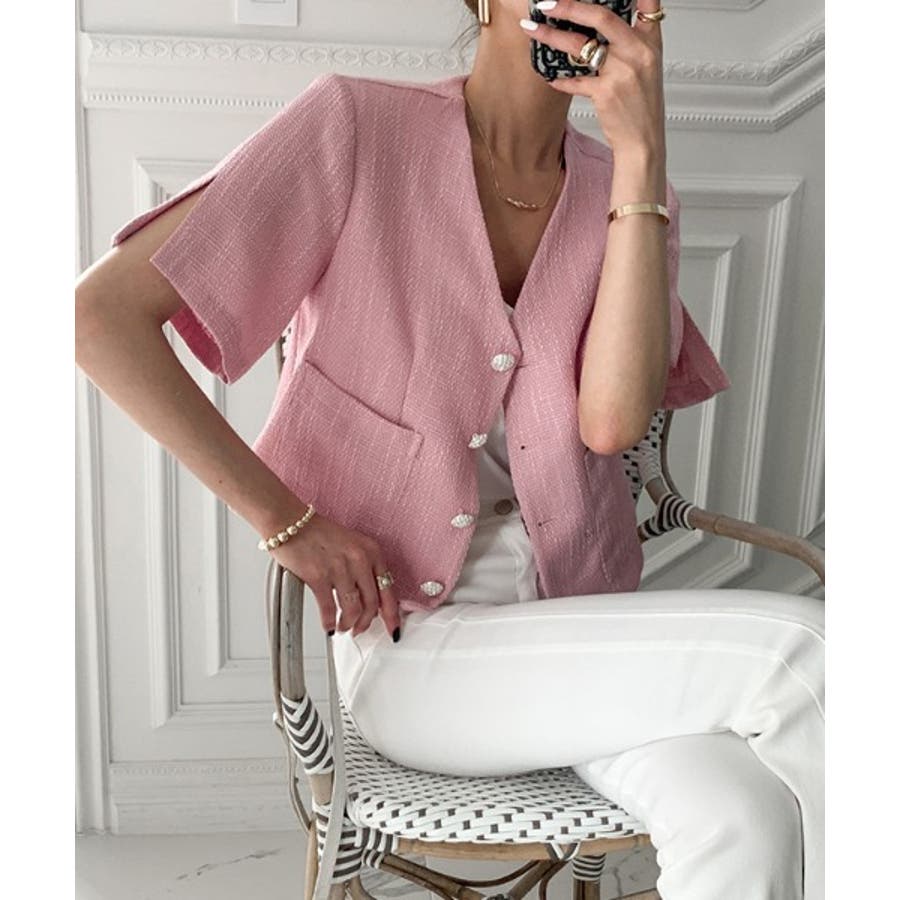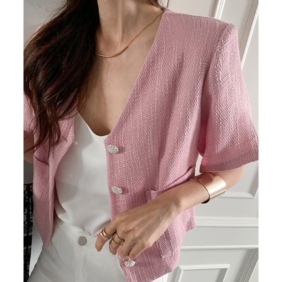 肩パッドが入っていますが、片方が変な癖がついてしまっていていかり肩に見えます。裏地なしで生地自体は薄くはないですが全体的な印象でペラペラ感があり、お作りも雑な気がします。サイズ感はMサイズくらいでしょうか。色味はコーラルピンク寄りの濃いめのピンクです。ボタンはビジューのようなので可愛いです。