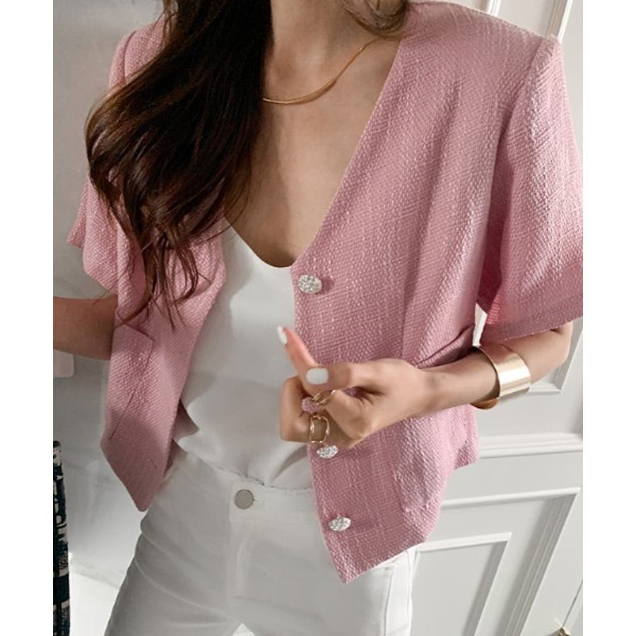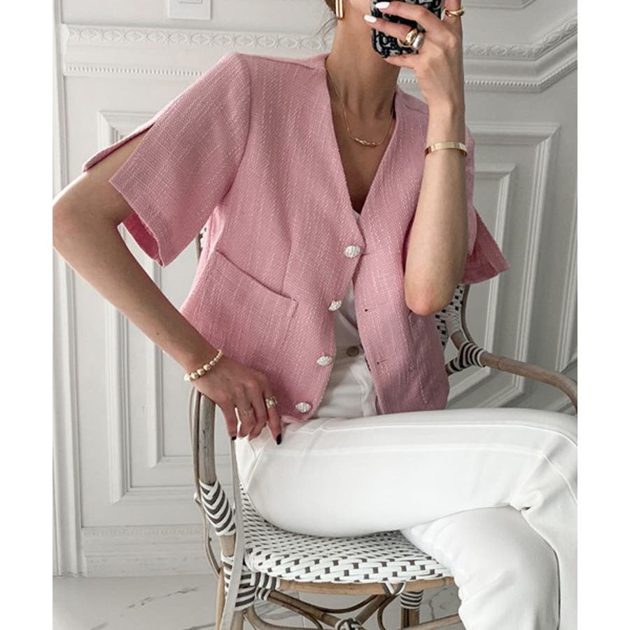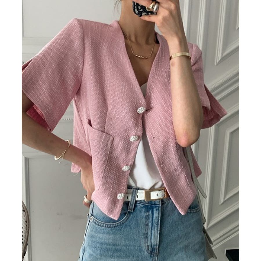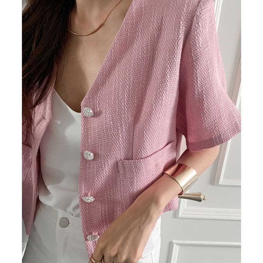 肩パッドが入っていますが、片方が変な癖がついてしまっていていかり肩に見えます。裏地なしで生地自体は薄くはないですが全体的な印象でペラペラ感があり、お作りも雑な気がします。サイズ感はMサイズくらいでしょうか。色味はコーラルピンク寄りの濃いめのピンクです。ボタンはビジューのようなので可愛いです。