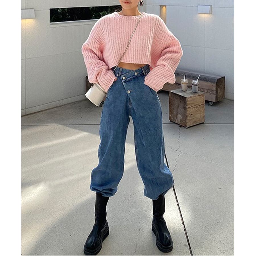アンバランスなラップスタイルのユニークなデニムパンツを紹介します。