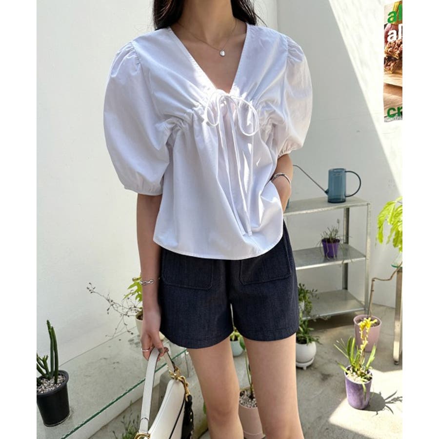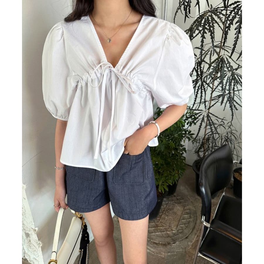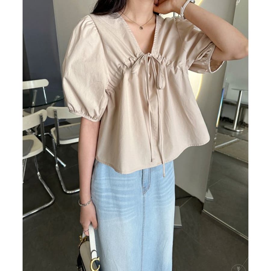 ロマンチックな雰囲気のシャーリングリボンブラウスを紹介します。