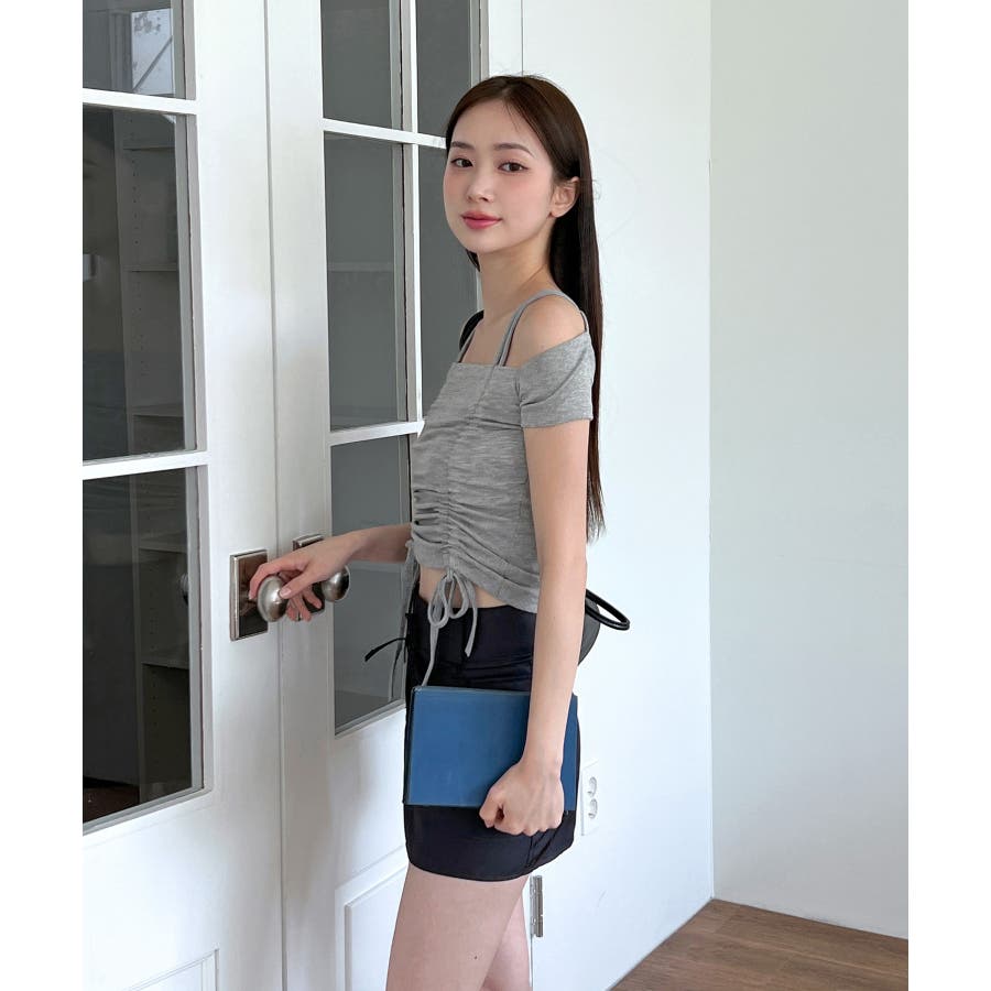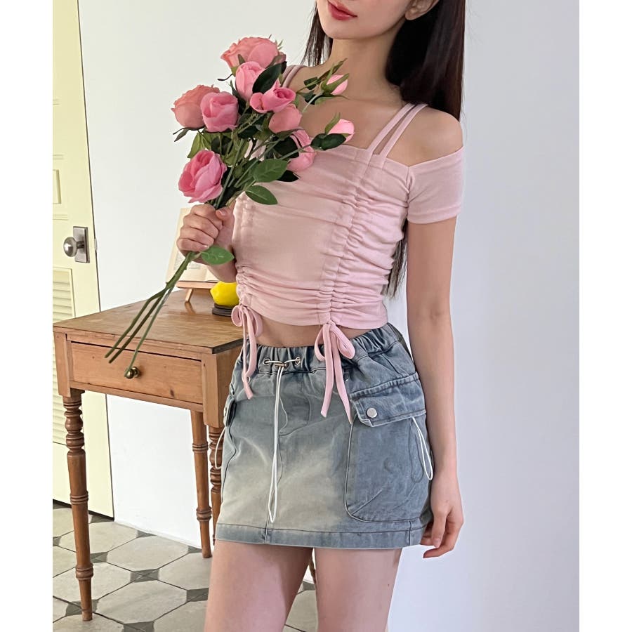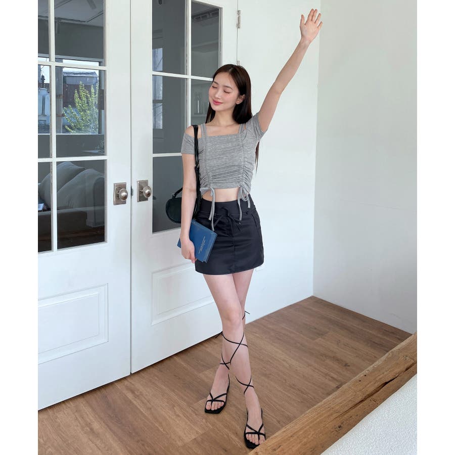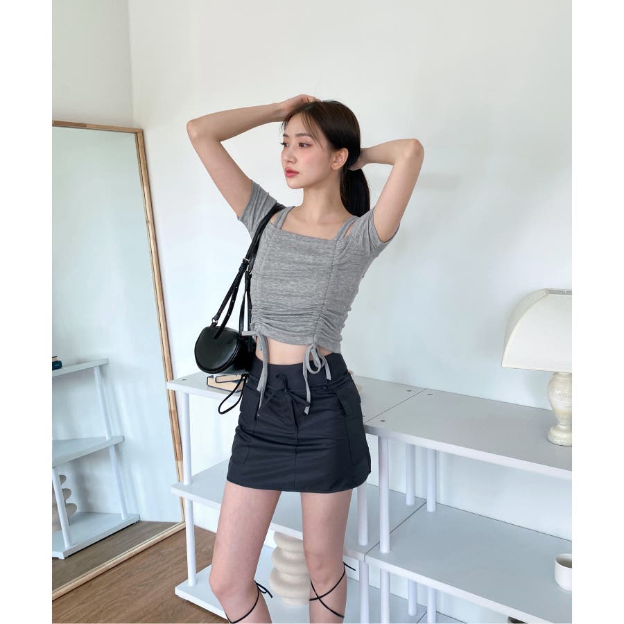 ダブルストラップとシャーリングがお洒落なTシャツを紹介します。