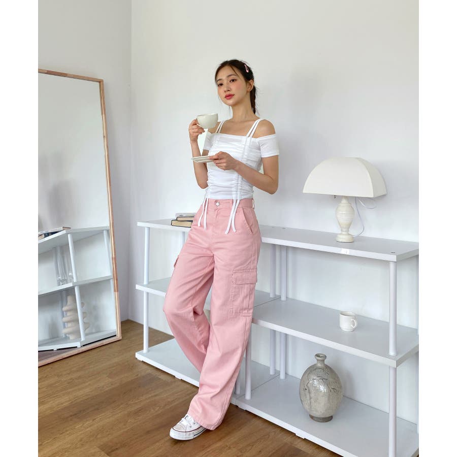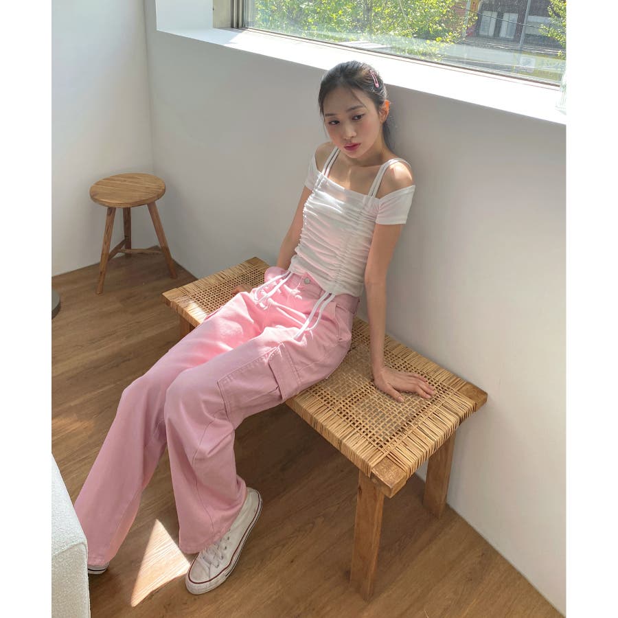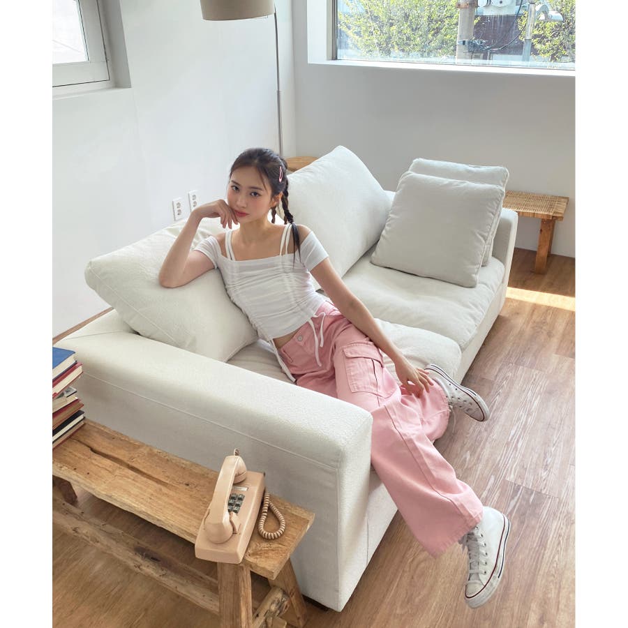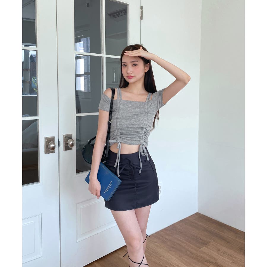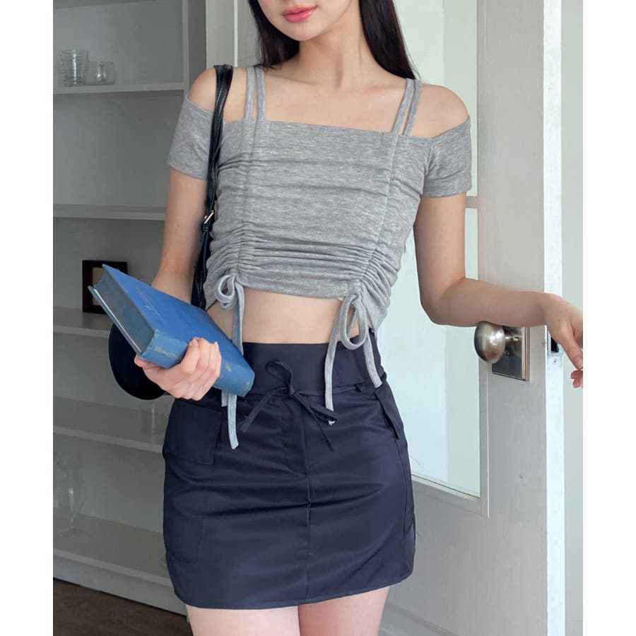 ダブルストラップとシャーリングがお洒落なTシャツを紹介します。