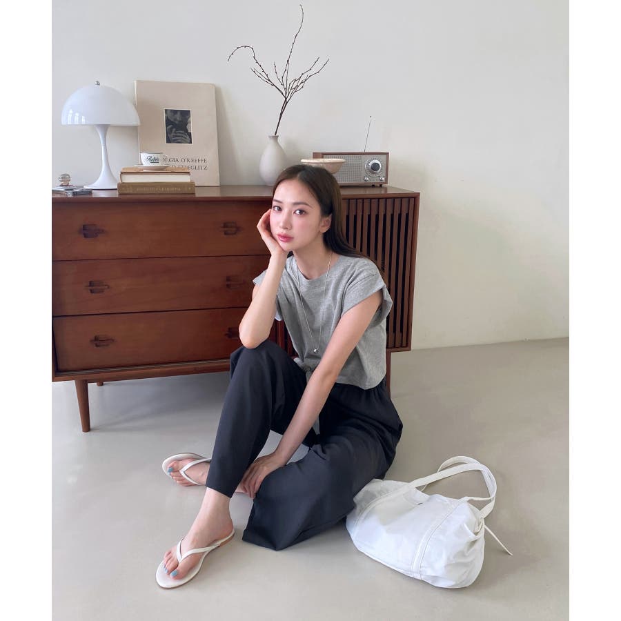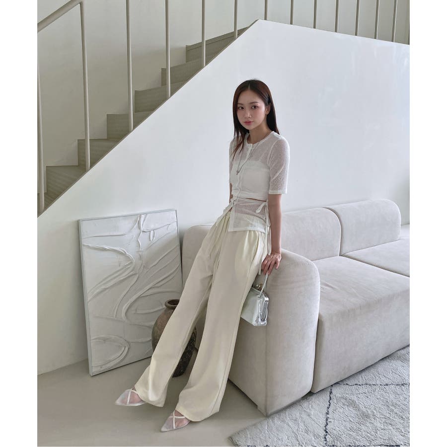薄い夏ニット素材カーディガンと快適にスリッパとマッチしてカフェ行きたいパンツですよ