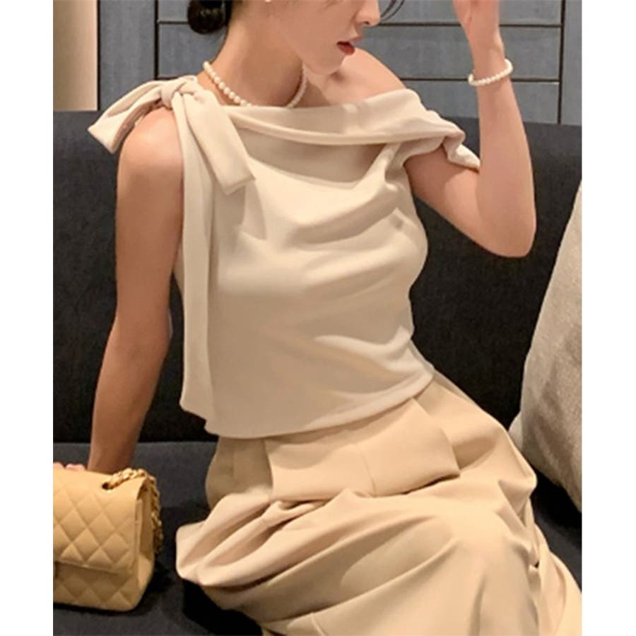 アンバランスなオフショルダーがポイントのリボンブラウスを紹介します。