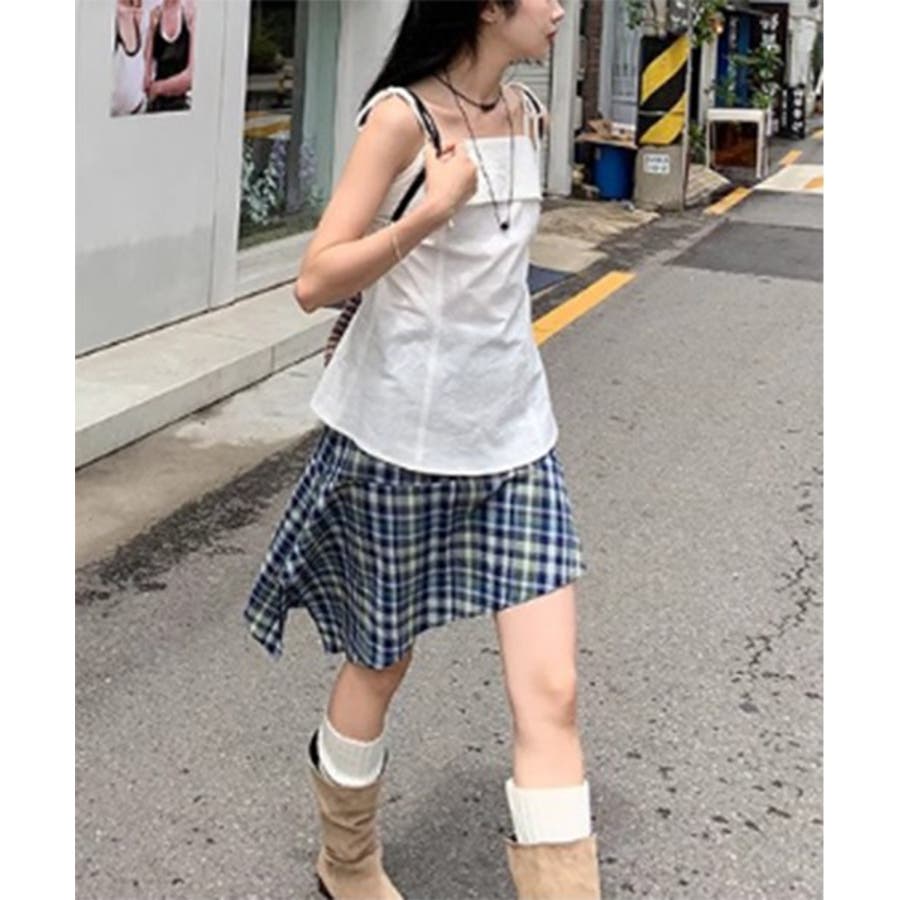 チェック柄がポイントになるアンバランススカートを紹介します。