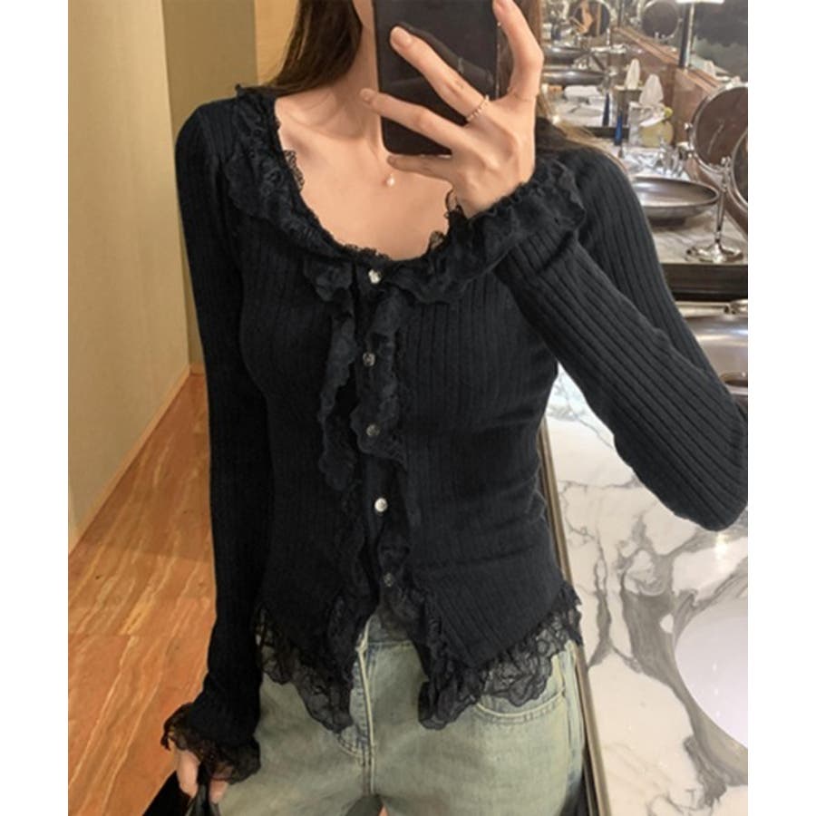 【レースUネックリブニットカーディガン】