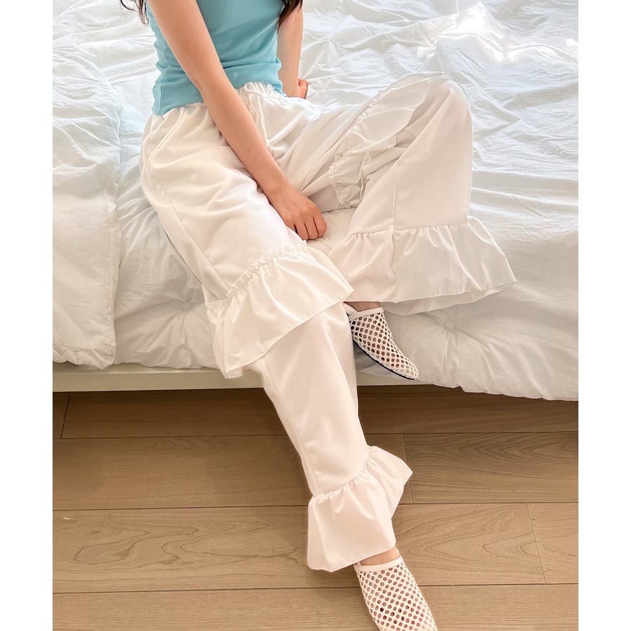 ベーシックなパンツに2段のフリルが加わり