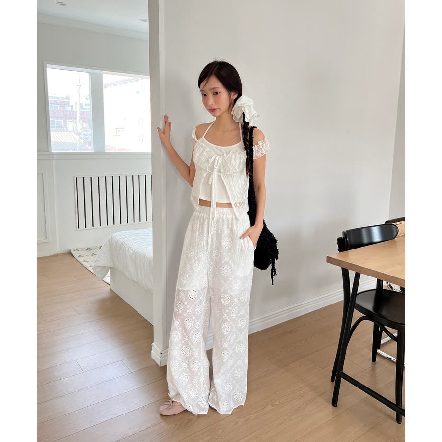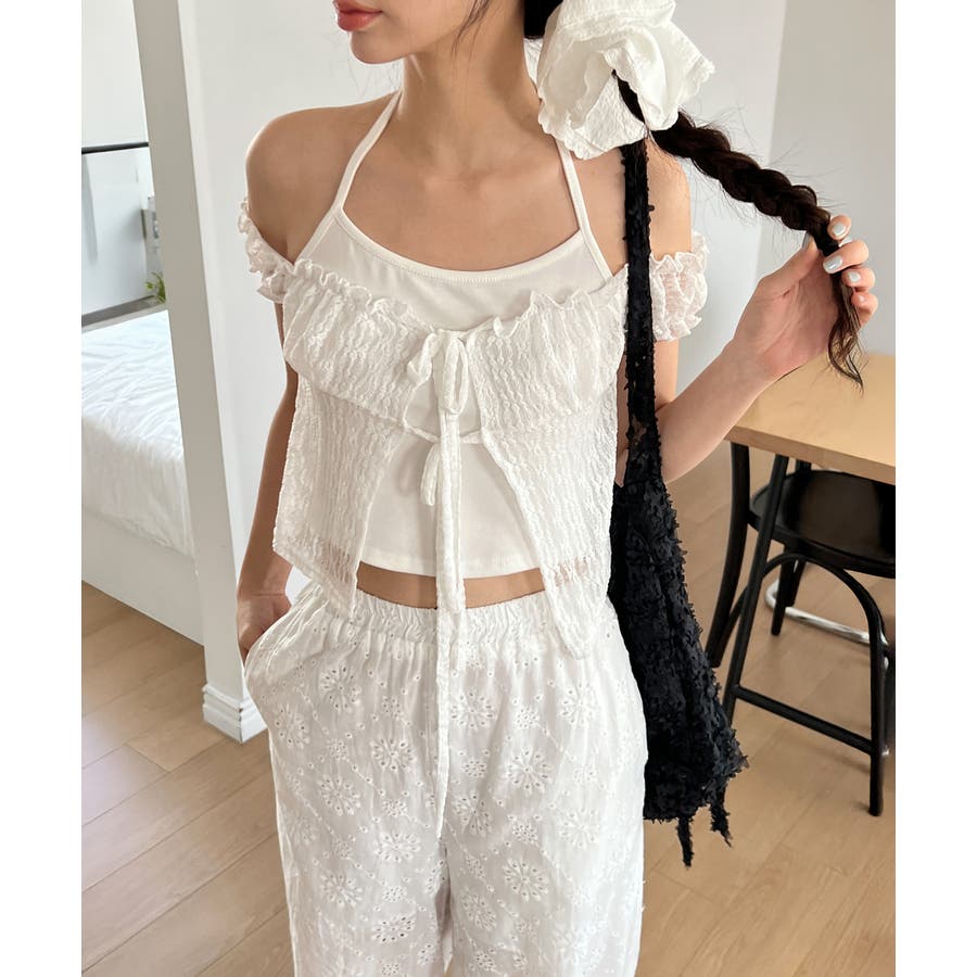 フラワー柄のレース素材に肩にフリル、ネックラインにはシャーリングディテールで