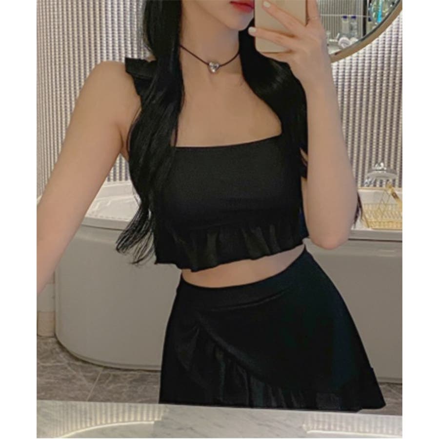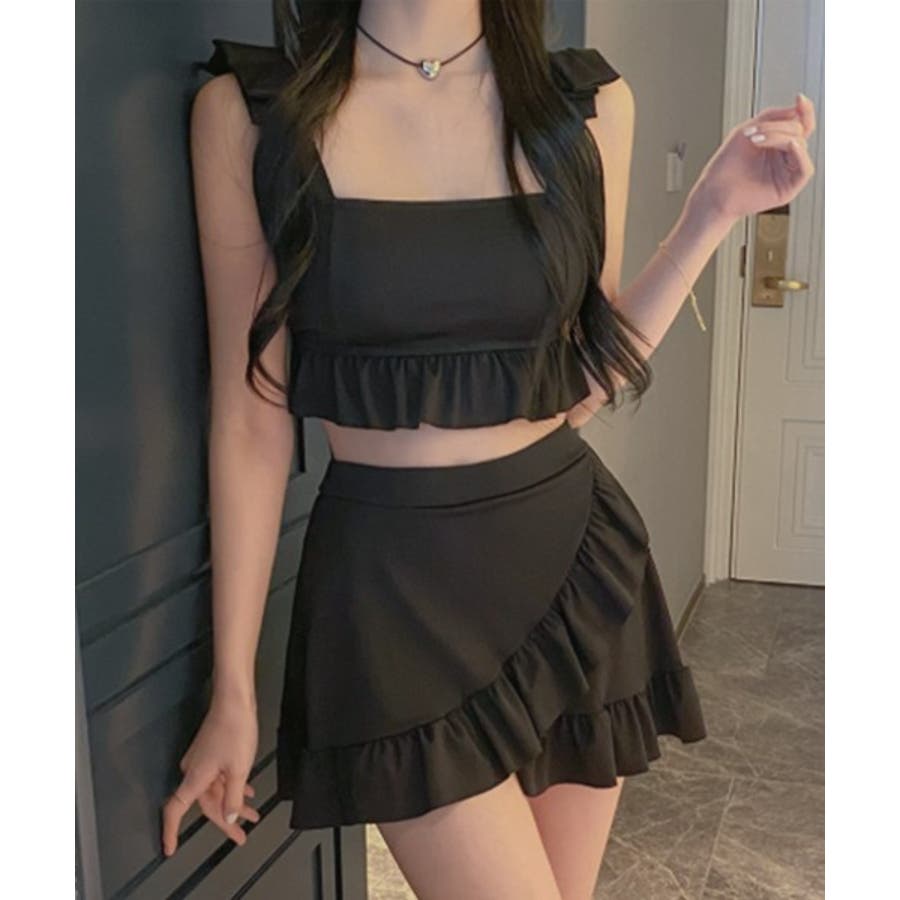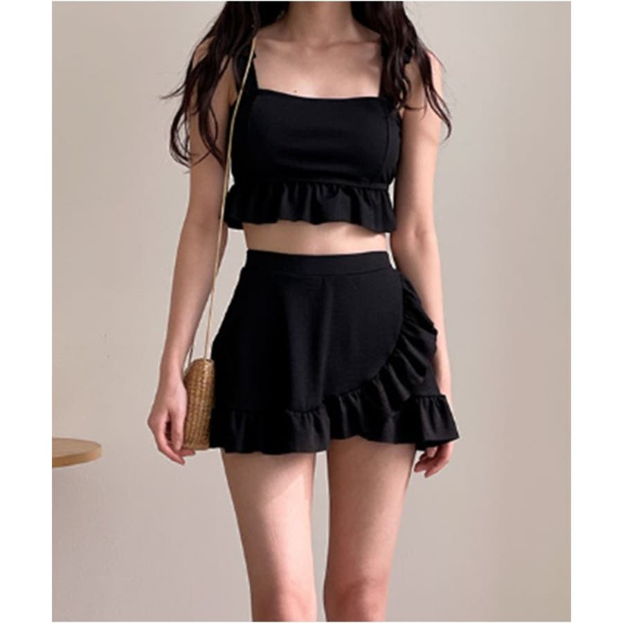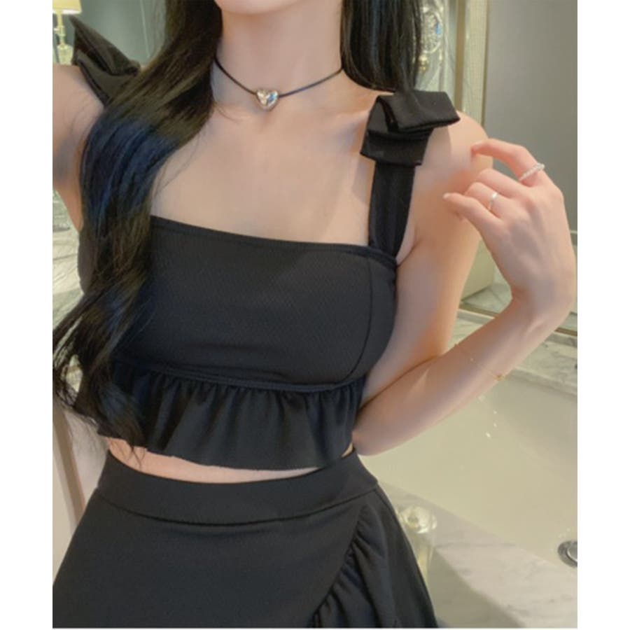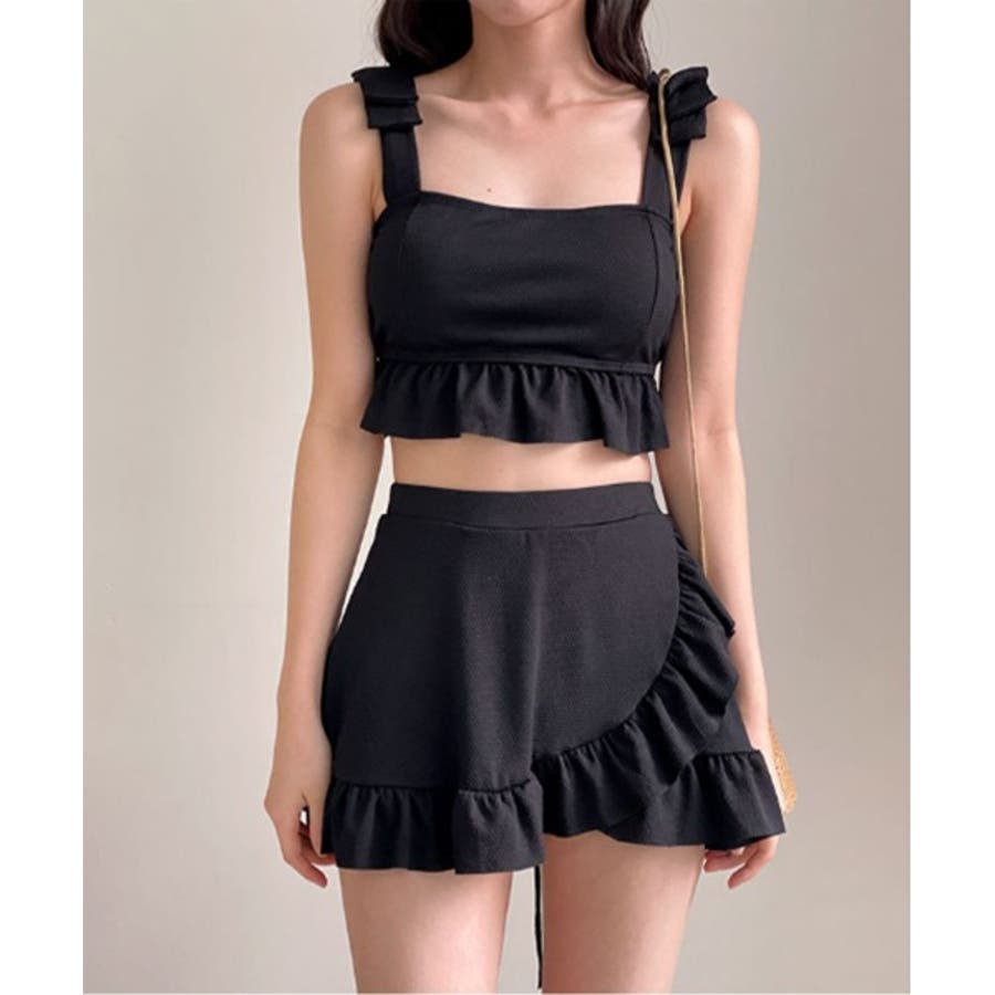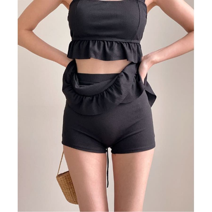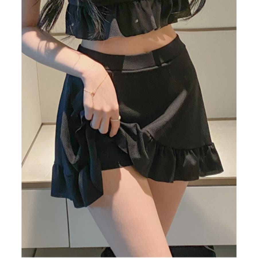 バスト下のフリルやスカート風のアシメフリルがフェミニンな雰囲気を演出。