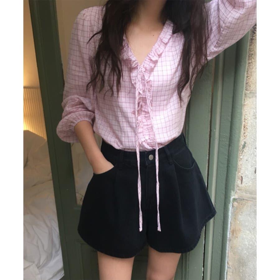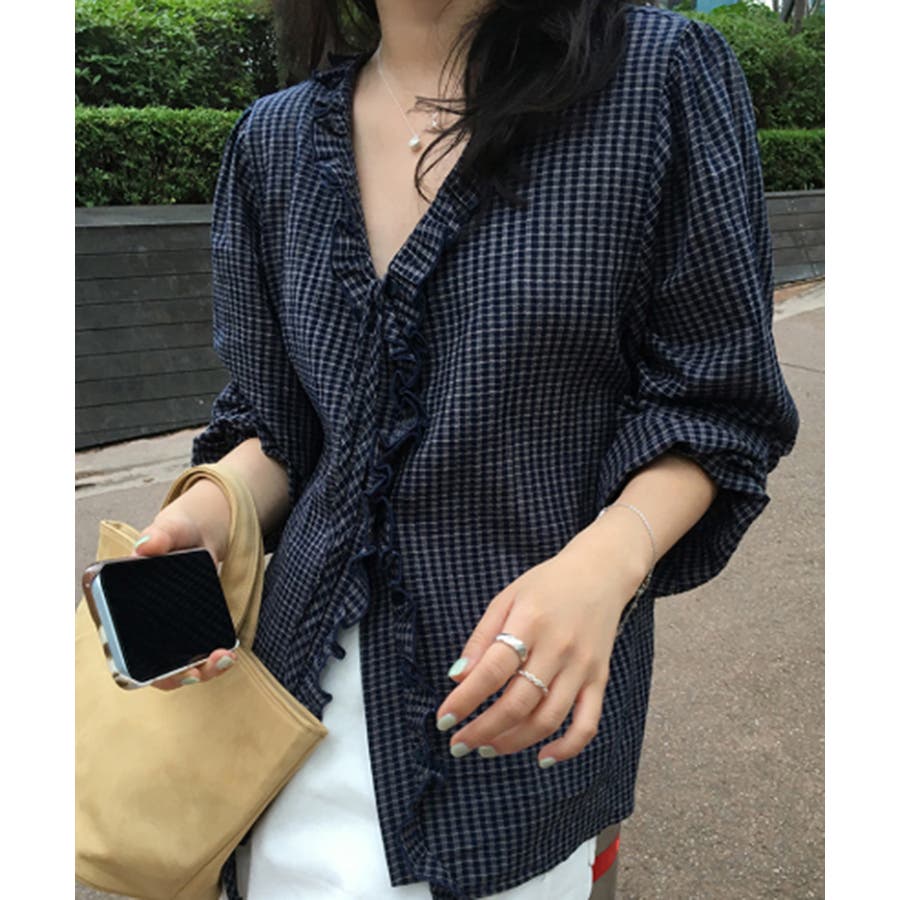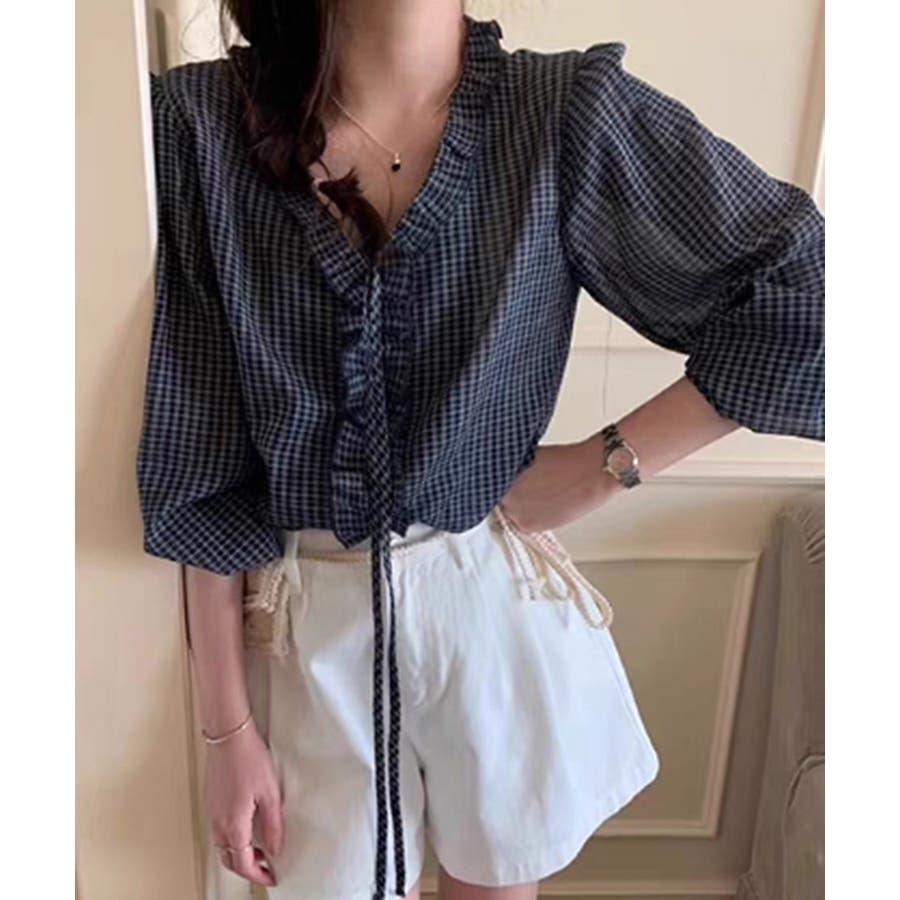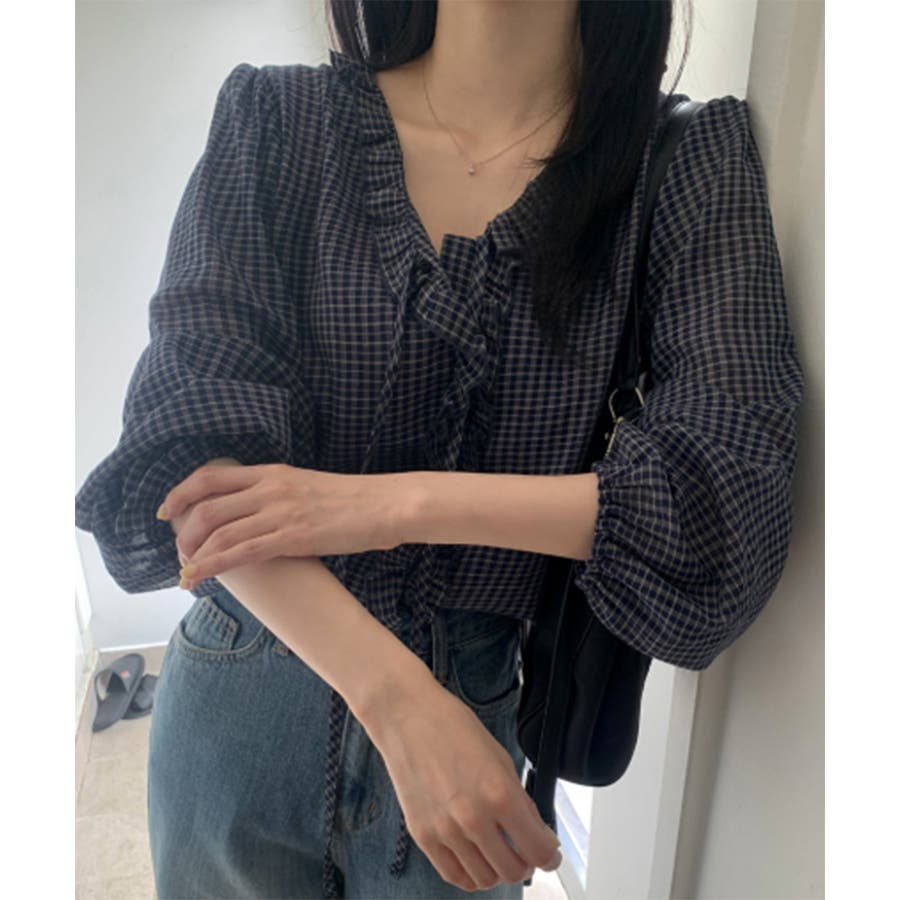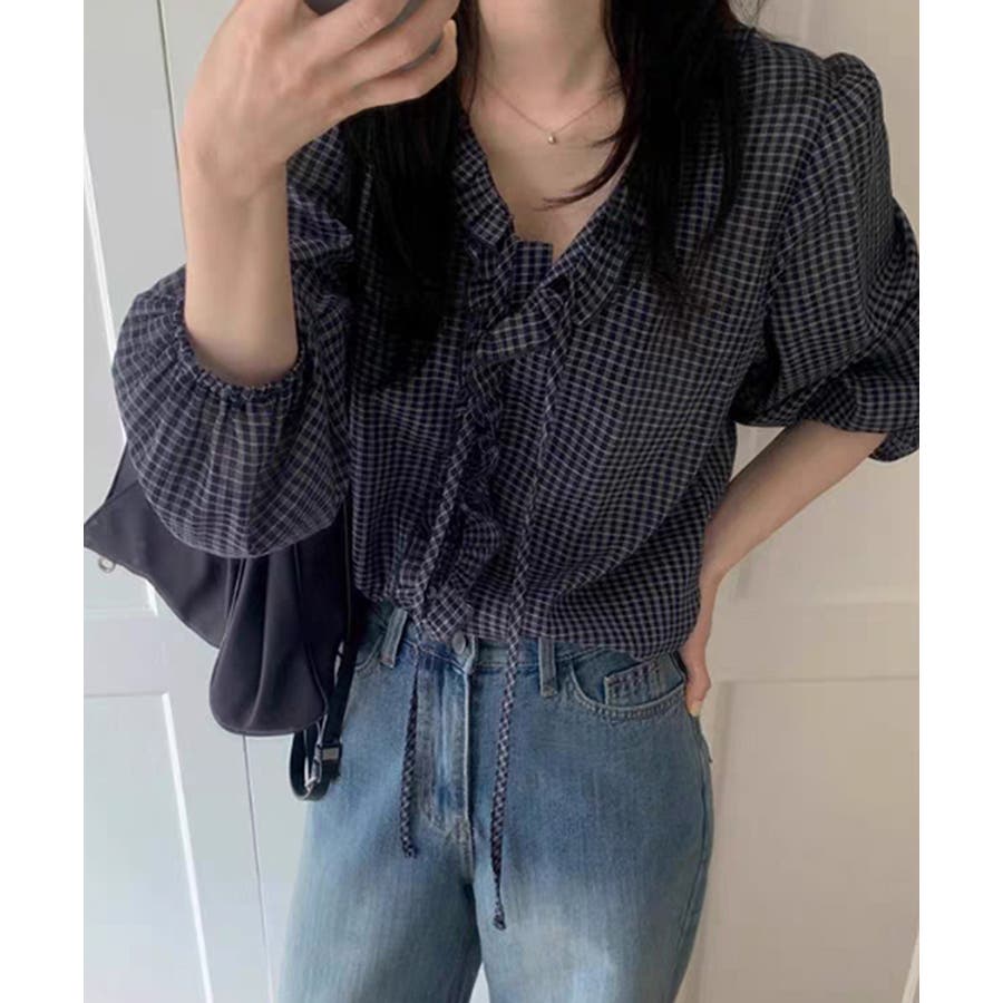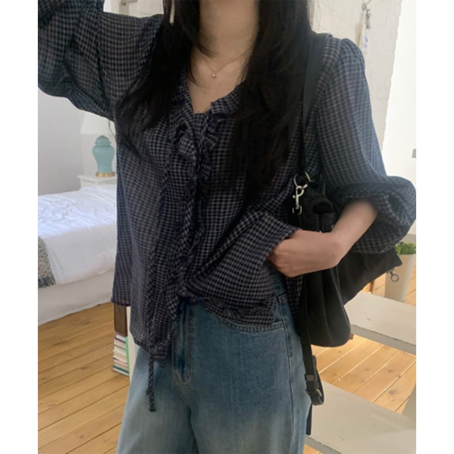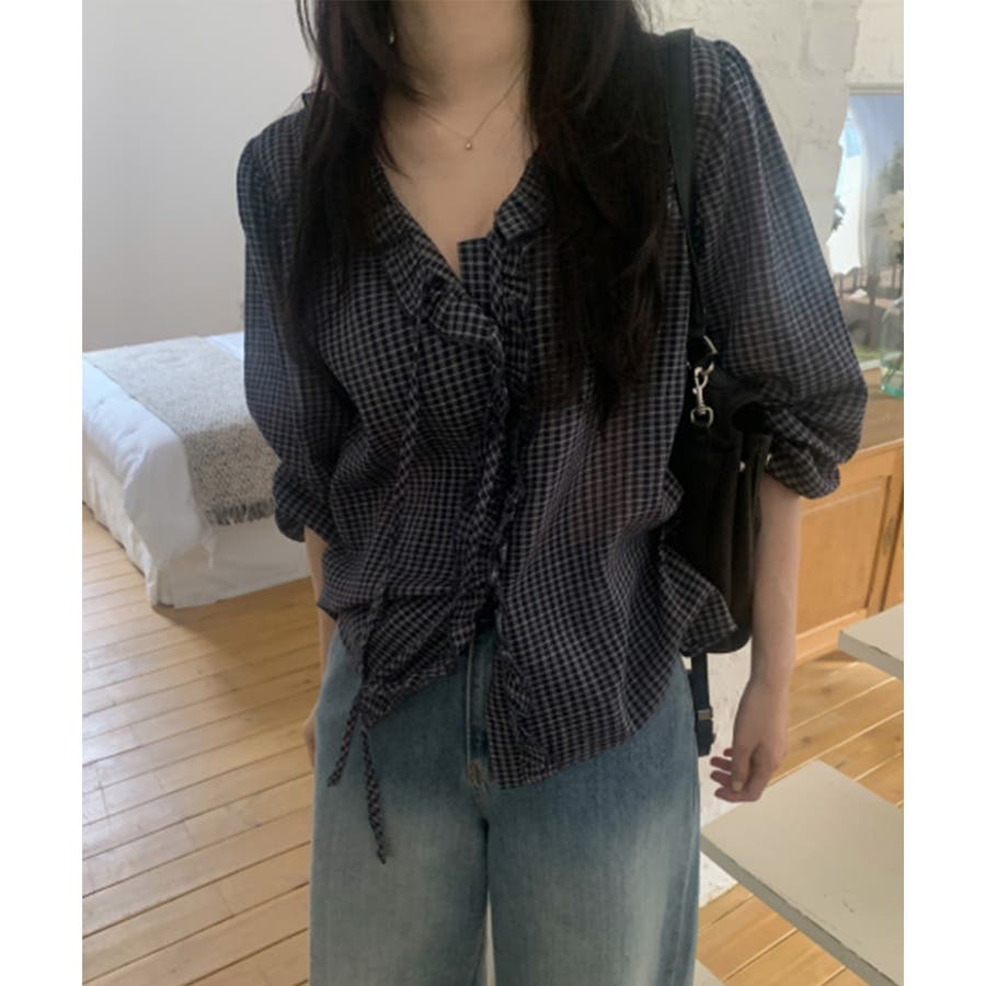 チェックラッフルブラウス
