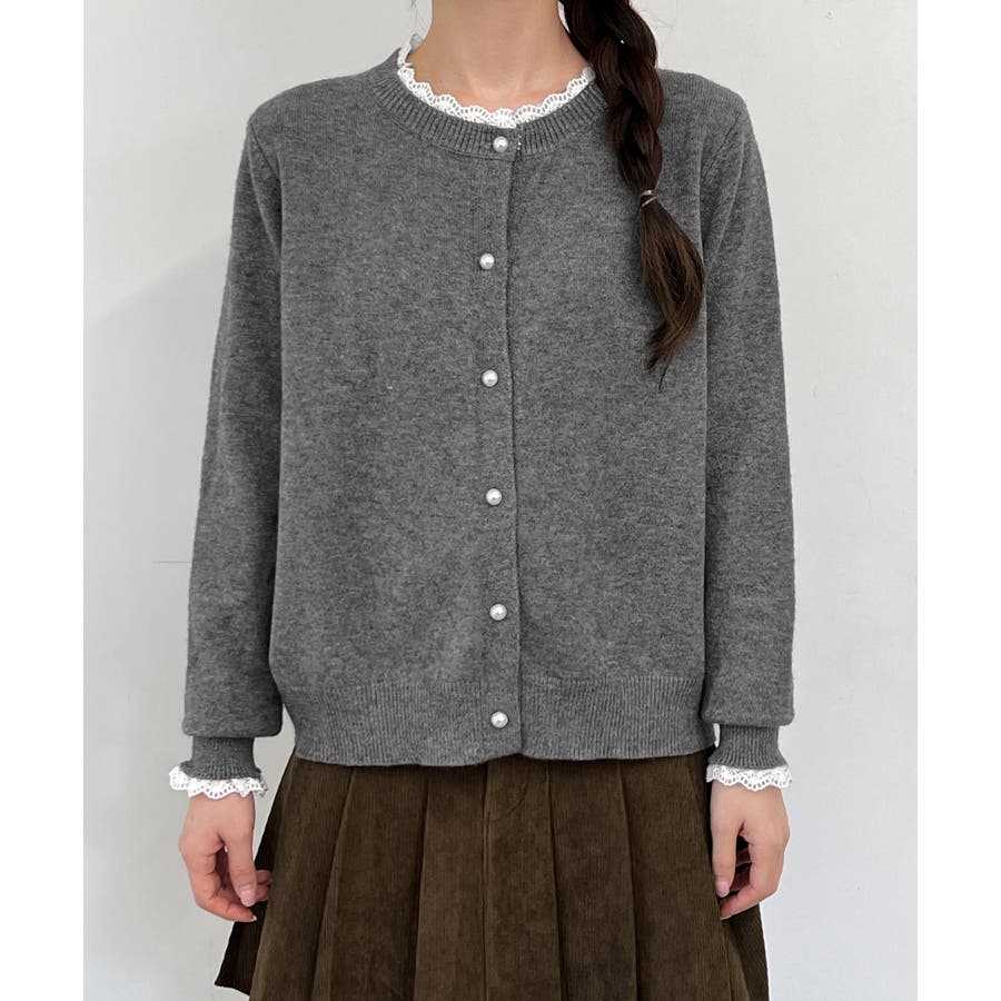 シンプルなラウンドネックにパールボタンをあしらった、フェミニンな印象のカーディガンです。