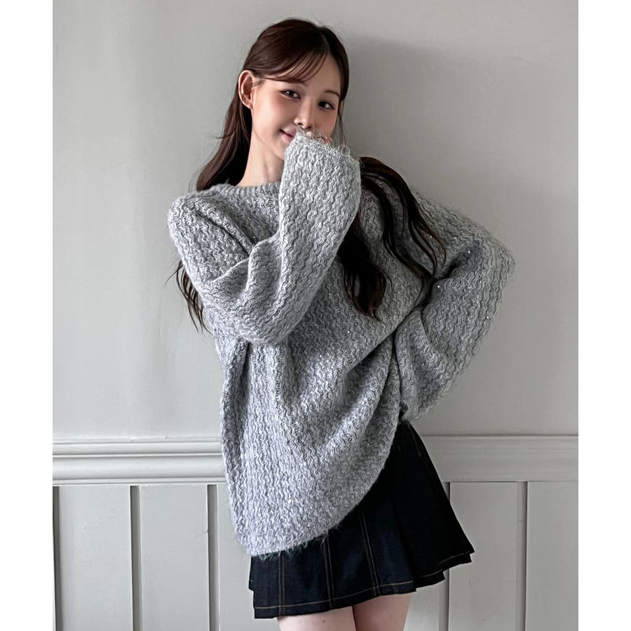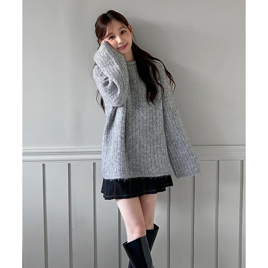 ニットに散りばめられたスパンコールが動くたびにほのかに輝き、ラグジュアリーなアクセントをプラス。