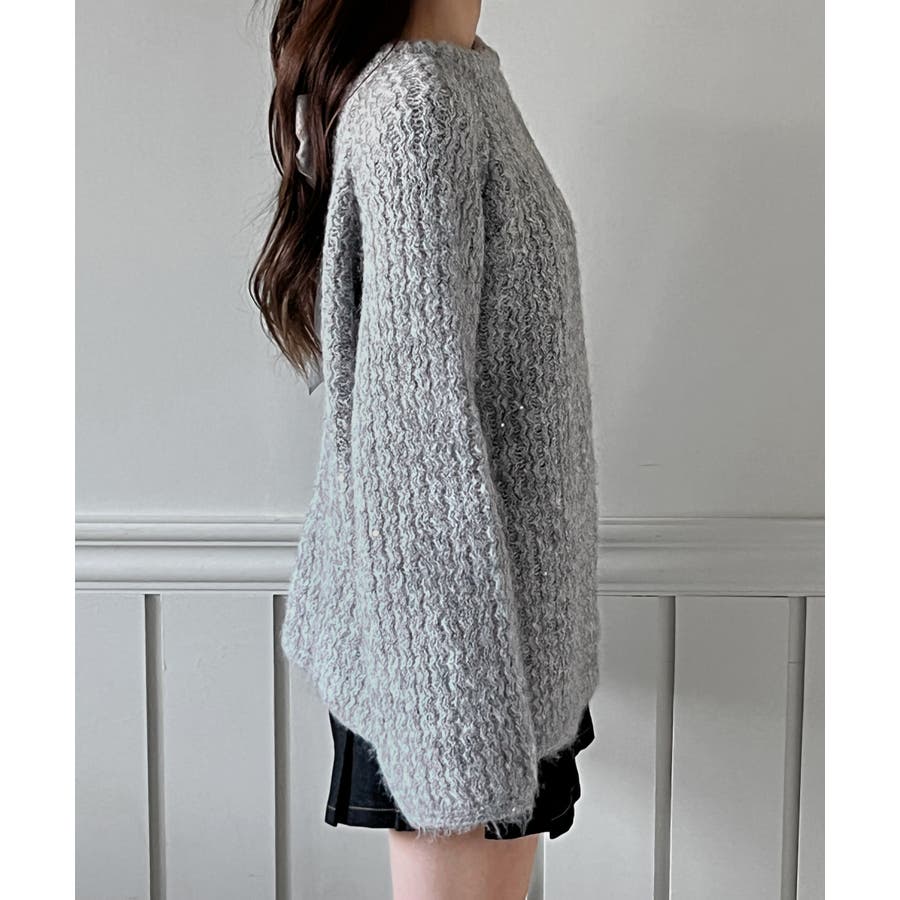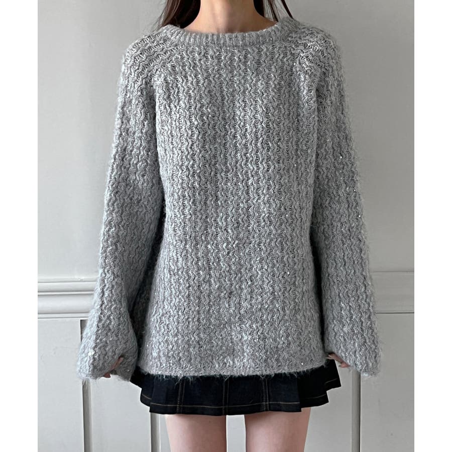 ニット全体にあしらわれたスパンコールがさりげなく煌めき、上品で華やかな印象に
