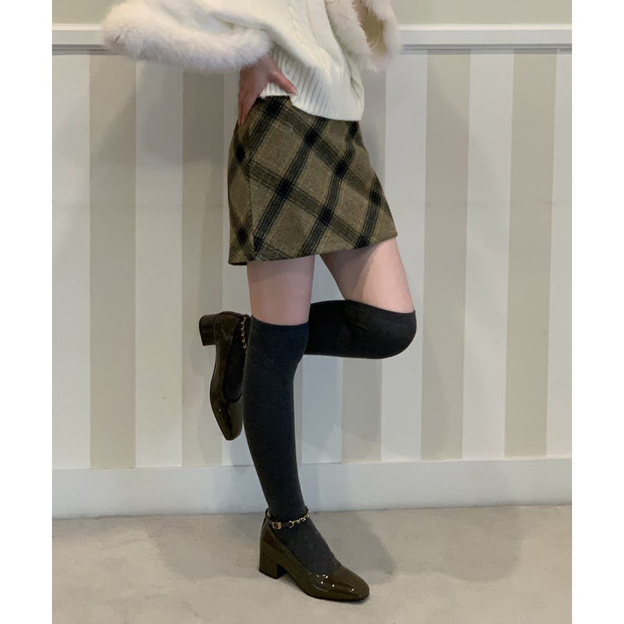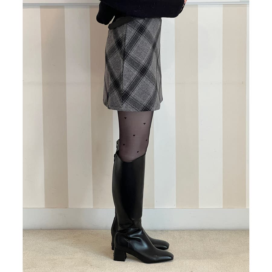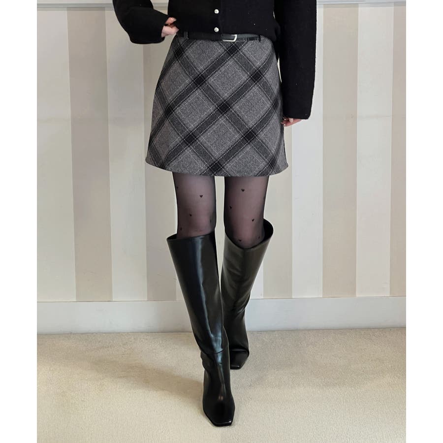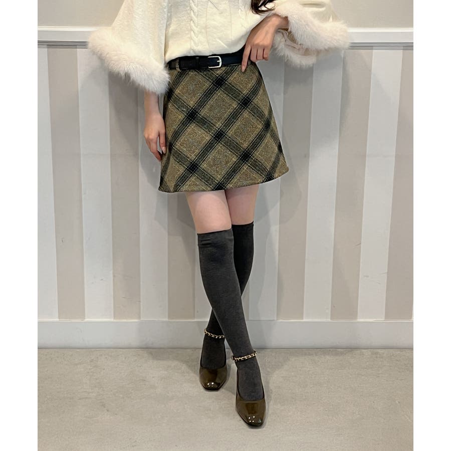 シックなカラーコンビのチェックパターンが目を引く、ベルテッドミニスカート。